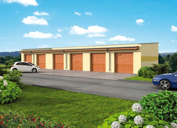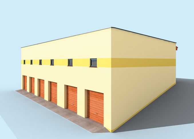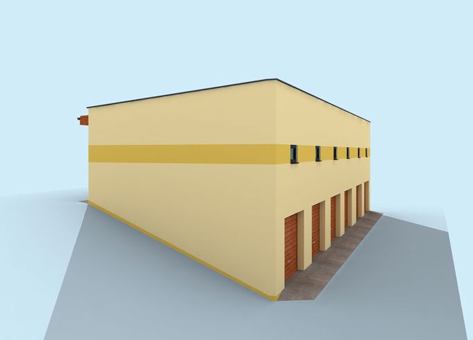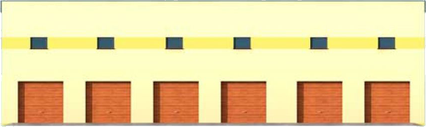 Technologia tradycyjna : - ściany zewnętrzne nośne murowane grubości 25cm - wszystkie ściany wykonane z pustaków ceramicznych "POROTHERM" - wysokość budynku 6,64m - dach jednospadowy 5° - więźba dachowa drewniana - pokrycie dachu papa - wymiar bram garażowych 6x 2,4x2,2m i 6x 2,4x2,4m