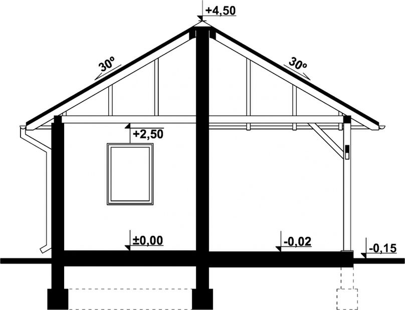 Budynek wykonany w technologii tradycyjnej. Ściany murowane z bloczków z betonu komórkowego grubości 24cm. Więźba dachowa czterospadowa, drewniana, pokryta blachodachówką.