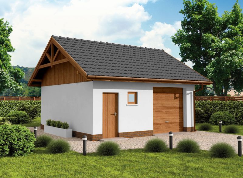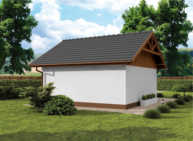 Technologia tradycyjna: ściany zewnętrzne nośne murowane grubości 25cm, ściany wewnętrzne działowe grubości 12cm, wszystkie ściany wykonane z pustaków ceramicznych, więźba dachowa drewniana, pokrycie dachówka ceramiczna, wymiar bramy garażowej 2,4x2,4m.