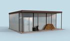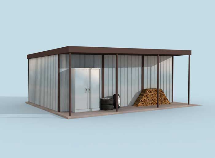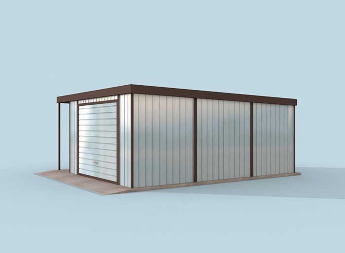 Technologia tradycyjna: budynek zaprojektowano w technologii szkieletu stalowego, pokrycie dachu z blachy trapezowej, wymiar bram garażowych 2,5 x 2,125 m.