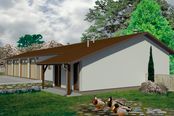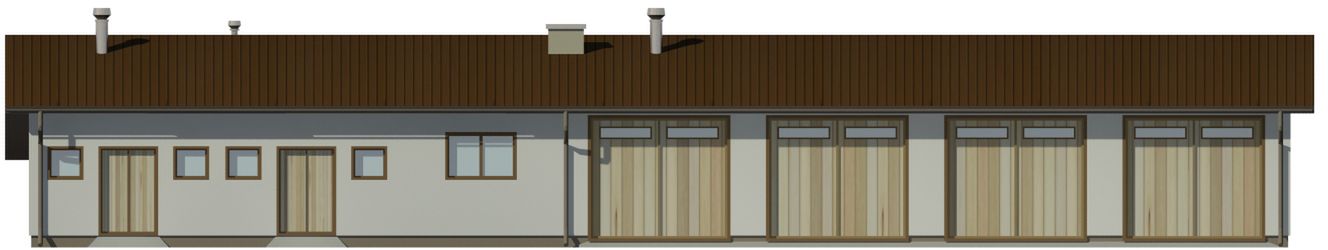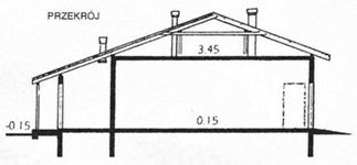 Ściany zewnętrzne: Ściany murowane. Strop: Nad pomieszczeniami magazynowymi strop żelbetowy monolityczny lub ceglany na belkach stalowych.. Dach: Więźba dachowa (alternatywnie wiązar) drewniana, dach o nachyleniu 20° kryty blachą. Nad pomieszczeniami magazynowymi strop żelbetowy monolityczny lub ceglany na belkach stalowych.. Dodatkowe informacje: Projekt zawiera schemat łączenia segmentów na mniejsze budynki.
