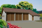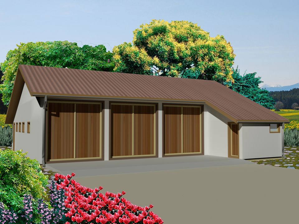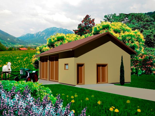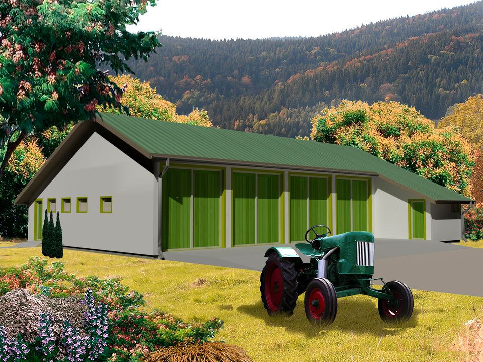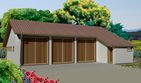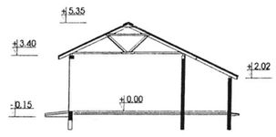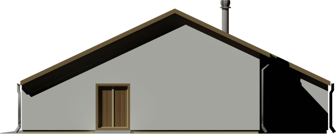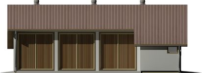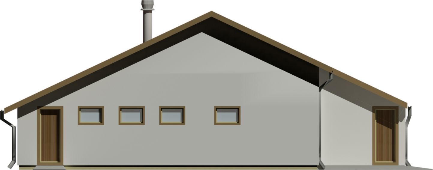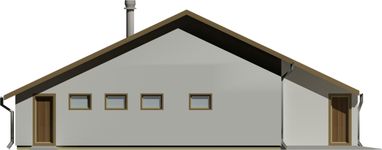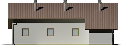 Ściany zewnętrzne: Ściany murowane. Dach: Dwuspadowy, o kacie nachylenia 20 stopni. Wiązar drewniany, kryty płytami falistymi.. Poziom kalenicy: 5,5 m od terenu. Dodatkowe informacje: Projekt zawiera wersje o mniejszej ilości segmentów i bez przedłużania połaci dachowych.