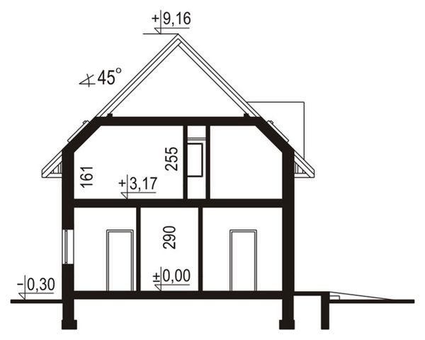 Ściany zewnętrzne: gr. 39 cm z pustaków ceramicznych MAX + styropian. Strop: żelbetowy. Dach: dwuspadowy o nachyleniu 45 stopni, kryty dachówką. Poziom kalenicy: 9,46 m od terenu.