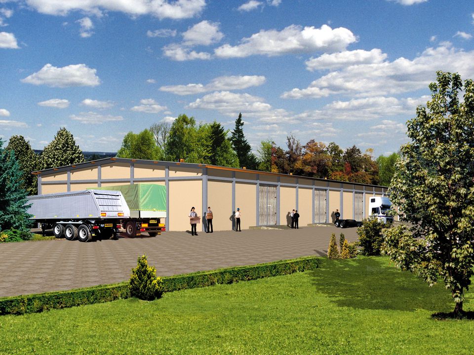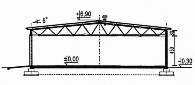 Ściany zewnętrzne: gr. 30 cm z bloczków betonu komórkowego. Dach: dwuspadowy, o nachyleniu 6 stopni, wiązary kratowe stalowe W-102 o rozp. 21 m, krycie blachą stalową, trapezową. Poziom kalenicy: 7,20 m od terenu. Dodatkowe informacje: W cenie dokumentacja wiązara stalowego W-102