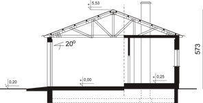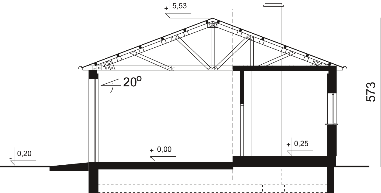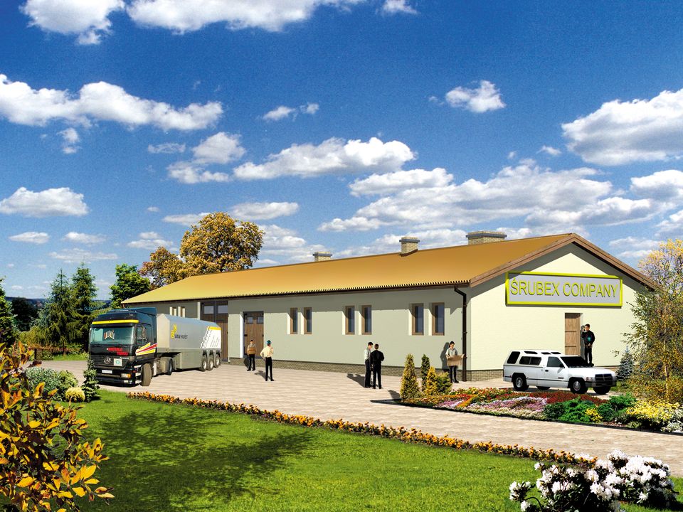 Ściany zewnętrzne: gr. 24 i 37 cm z bloczków PGS w hali gr. 34 z bloczków PGS + styropian w części socjalnej. Podstawowym układem nośnym budynku jest układ ścian i wiązarów deskowych w rozstawie podłużnym 2,25 m i poprzecznym 9,0 m.. Strop: podwieszony, ocieplony. Dach: dwuspadowy, o nachyleniu 20 stopni, wiązary kratowe, krycie blachą. Poziom kalenicy: 5,50 m od terenu. Dodatkowe informacje: Segmentowy układ pozwala na dostosowanie długości obiektu do indywidualnych potrzeb.