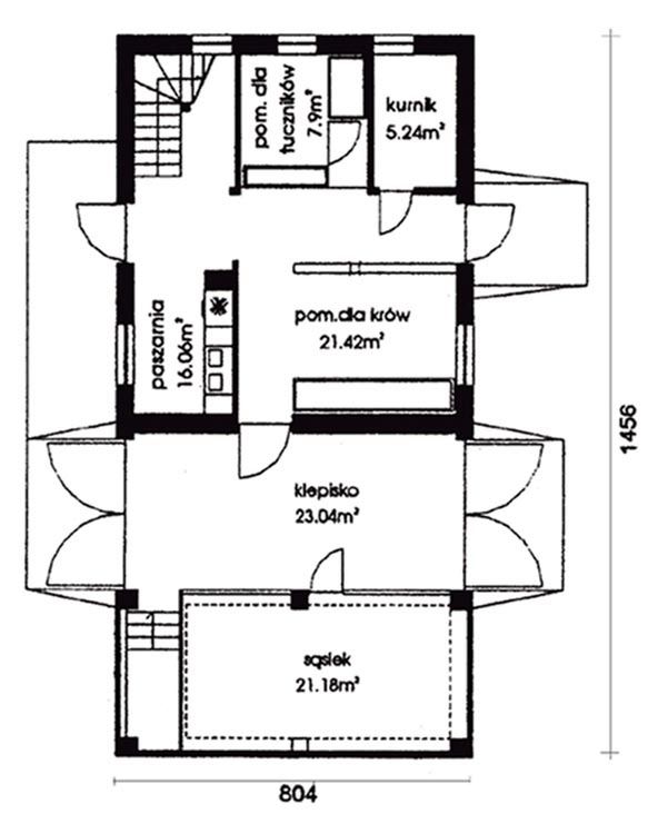 Ściany zewnętrzne: gr. 39 cm z pustaków ALFA + styropian + pustak ALFA. Strop: żelbetowy. Dach: dwuspadowy o nachyleniu 39 stopni, kryty płytami ONDULINE. Poziom kalenicy: 7,45 m od terenu. Dodatkowe informacje: budynek częściowo podpiwniczony, ciężar krów do 500 kg