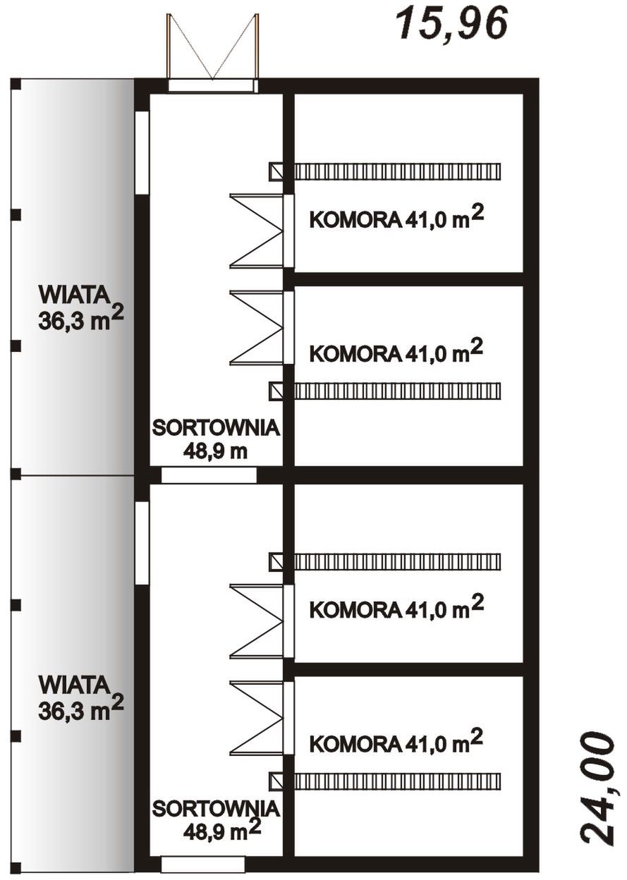 Fundamenty betonowe, ściany zewnętrzne z pustaków MAX 29cm, strop nad komorami i sortownią FERT. Więźba drewniana, pokrycie blachą dachówkową lub trapezową.