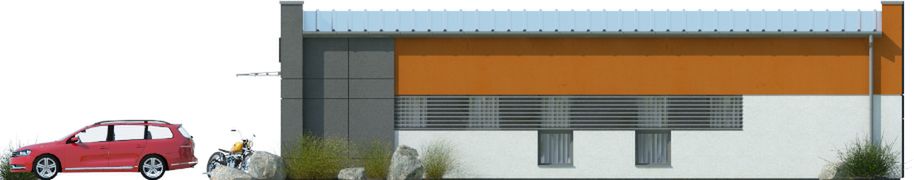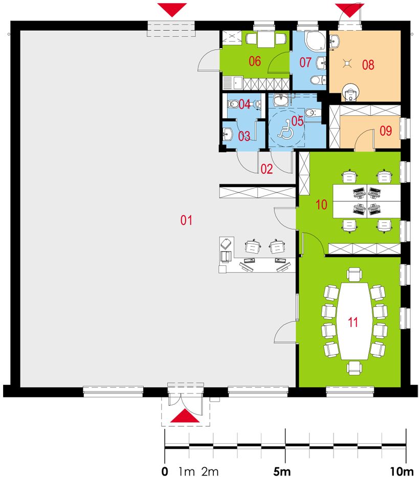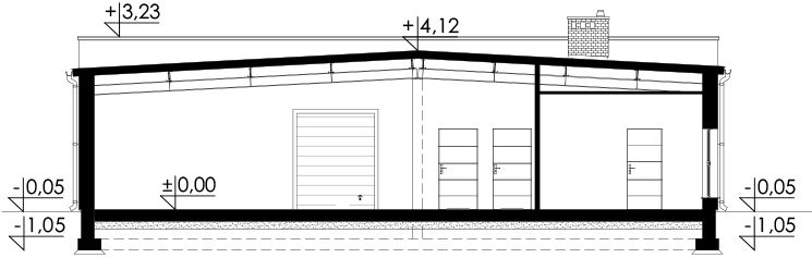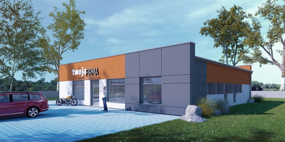 Ściany zewnętrzne: pustak ceramiczny LEIER o gr. 25cm + styropian Termo Organika o gr. 15cm + tynk. Dach: w konstrukcji stalowej w układzie dźwigarów dwuteowych, pokrycie stanowią płyty warstwowe z rdzeniem z wełny mineralnej BALEXTHERM-MW-R o grubości 15cm firmy BALEXMETAL. Źródło ciepła: kocioł gazowy, pompa ciepła, fotowoltaika. Pomieszczenie gospodarcze spełnia wymagania kotłowni na paliwo stałe, w związku z czym na etapie adaptacji istnieje możliwość zmiany sposobu ogrzewania. Wentylacja: mechaniczna nawiewno-wywiewna bez odzysku ciepła. Stolarka okienna i drzwiowa: okna i drzwi PVC, brama załadunkowa segmentowa.