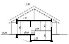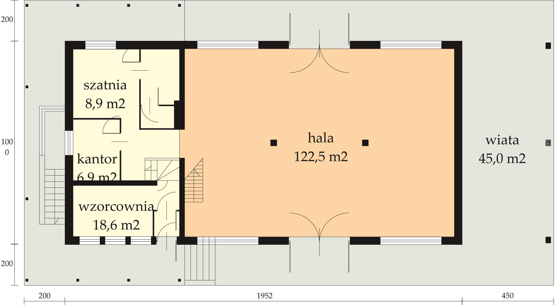 Ściany zewnętrzne: gr.40 cm z bloczków gazobetonowych 24 cm + styropian 4 cm + bloczki gazobetonowe 12 cm w hali, w części socjalnej gr. 38 cm z bloczków gazobetonowych. Strop: żelbetowy. Schody: stalowe i żelbetowe. Dach: dwuspadowy o nachyleniu 30 stopni, więźba drewniana, krokwiowo-płatwiowo-jętkowa, krycie blachą trapezową. Poziom kalenicy: 7,99 m od terenu w części wyższej. Dodatkowe informacje: Projekt zawiera rozwiązanie podstawowe z rampą i alternatywnie bez rampy. Projekt można zaadoptować na budynek produkcyjny.