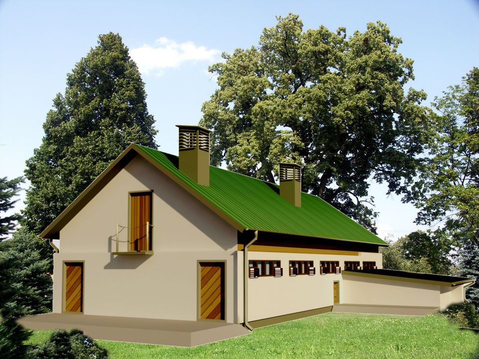 Graficzne opracowanie rzutów poglądowych widocznych na karcie projektu zostało wykonane przez Extradom.pl. Prezentowane przez Extradom.pl wizualizacje wykonane zostały przez autora projektu i należy poczytywać je jedynie za przykład i propozycję wykończenia, wizję architektoniczną autora projektu. Ostateczne wykończenie budynku może nastąpić na wiele sposobów. Szczegółowe rozwiązania zastosowane w oferowanej dokumentacji - w tym również ilość, lokalizacje i wygląd okien, drzwi, kominów - mogą w niewielkim stopniu różnić się od prezentowanej wizualizacji budynku.