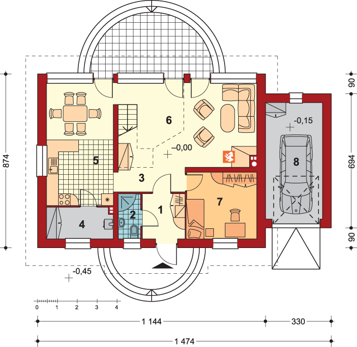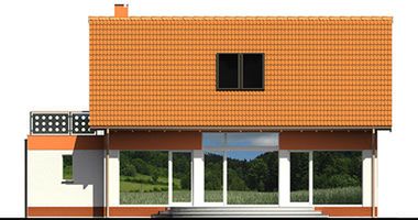Graficzne opracowanie rzutów poglądowych widocznych na karcie projektu zostało wykonane przez Extradom.pl. Prezentowane przez Extradom.pl wizualizacje wykonane zostały przez autora projektu i należy poczytywać je jedynie za przykład i propozycję wykończenia, wizję architektoniczną autora projektu. Ostateczne wykończenie budynku może nastąpić na wiele sposobów. Szczegółowe rozwiązania zastosowane w oferowanej dokumentacji - w tym również ilość, lokalizacje i wygląd okien, drzwi, kominów - mogą w niewielkim stopniu różnić się od prezentowanej wizualizacji budynku.