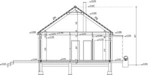 Ściany: szkieletowe 15 cm + styropian 031 - 15 cm (U=0,11 W/m2*K). Dach: gonty bitumiczne / dachówka / blacha. Strop: drewniany belkowy (U=0,13 W/m2*K).