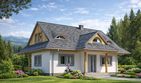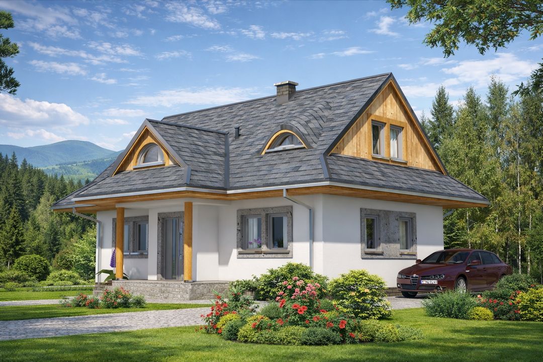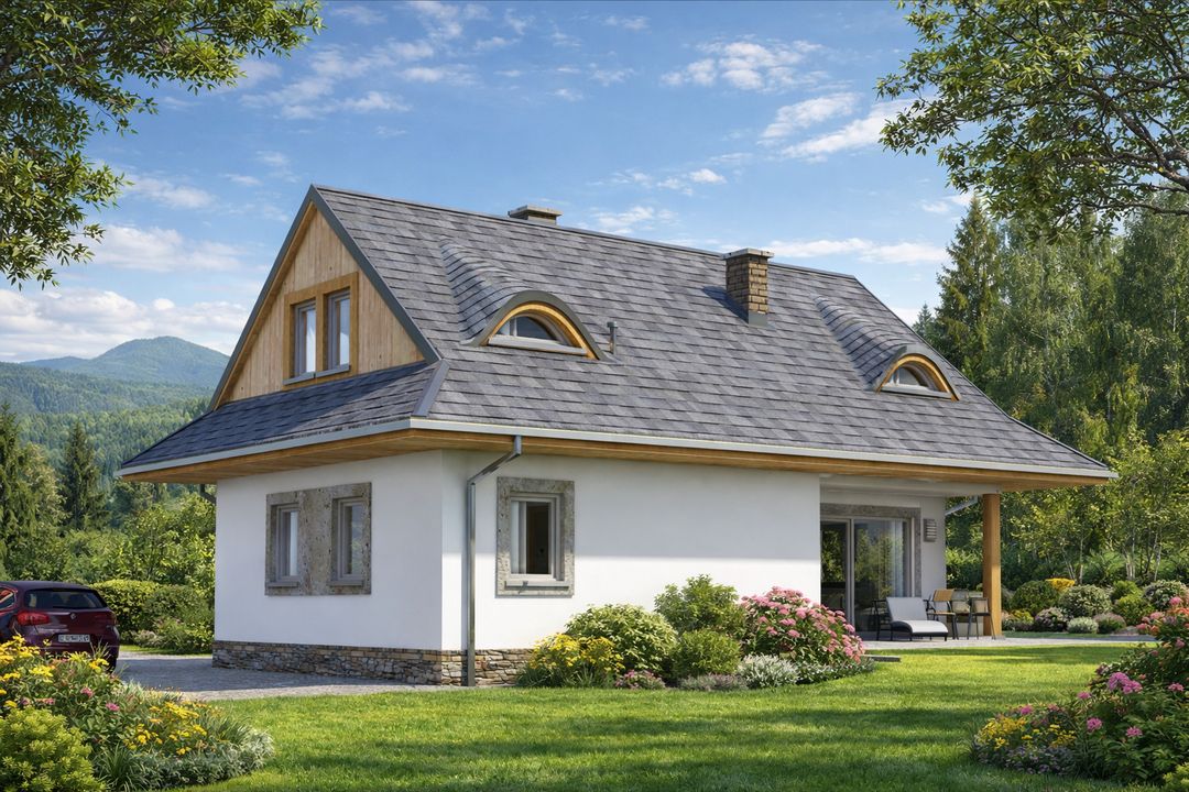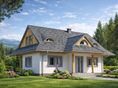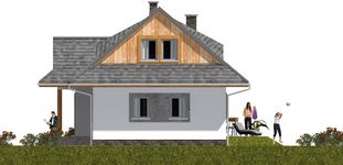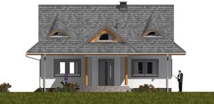 Graficzne opracowanie rzutów poglądowych widocznych na karcie projektu zostało wykonane przez Extradom.pl. Prezentowane przez Extradom.pl wizualizacje wykonane zostały przez autora projektu i należy poczytywać je jedynie za przykład i propozycję wykończenia, wizję architektoniczną autora projektu. Ostateczne wykończenie budynku może nastąpić na wiele sposobów. Szczegółowe rozwiązania zastosowane w oferowanej dokumentacji - w tym również ilość, lokalizacje i wygląd okien, drzwi, kominów - mogą w niewielkim stopniu różnić się od prezentowanej wizualizacji budynku.