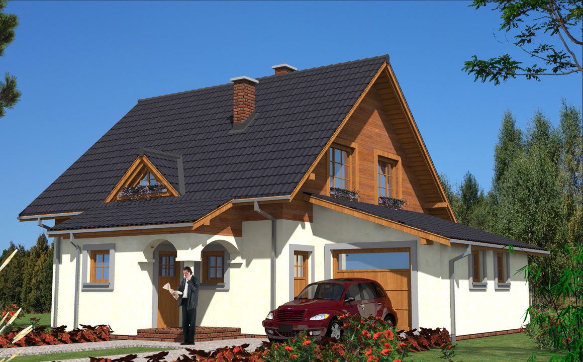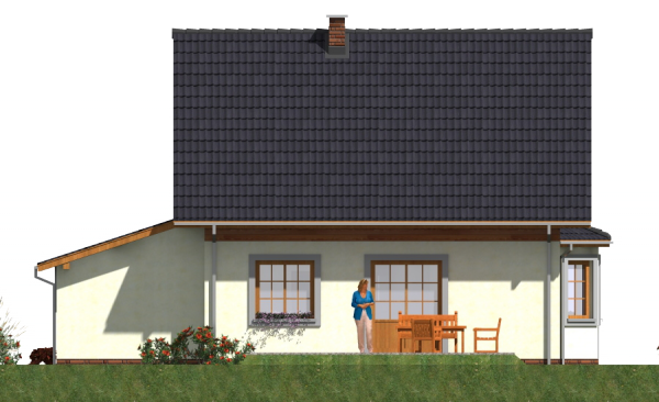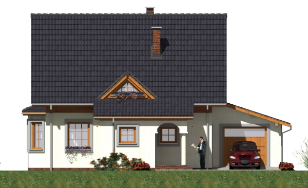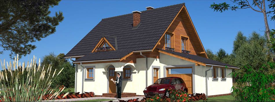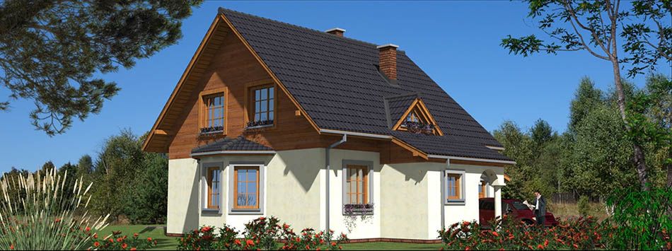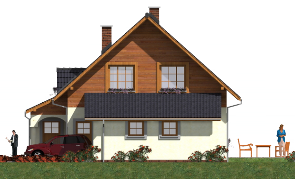 Graficzne opracowanie rzutów poglądowych widocznych na karcie projektu zostało wykonane przez Extradom.pl. Prezentowane przez Extradom.pl wizualizacje wykonane zostały przez autora projektu i należy poczytywać je jedynie za przykład i propozycję wykończenia, wizję architektoniczną autora projektu. Ostateczne wykończenie budynku może nastąpić na wiele sposobów. Szczegółowe rozwiązania zastosowane w oferowanej dokumentacji - w tym również ilość, lokalizacje i wygląd okien, drzwi, kominów - mogą w niewielkim stopniu różnić się od prezentowanej wizualizacji budynku.