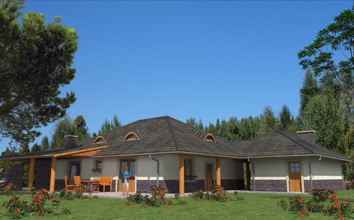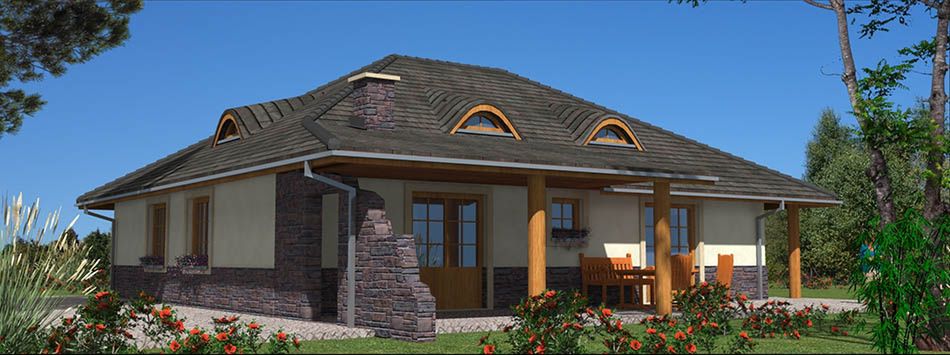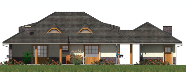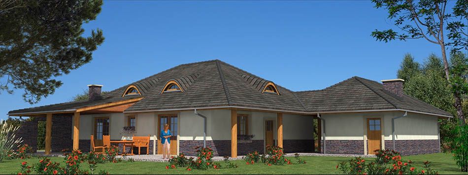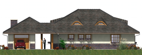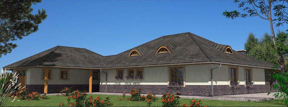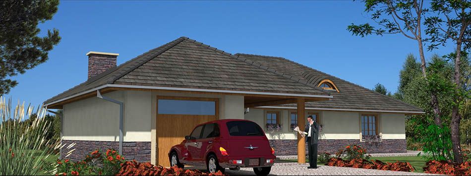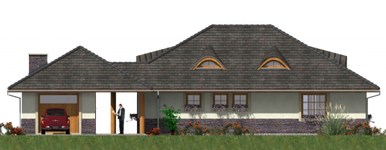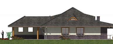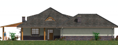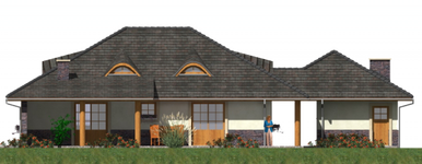 Graficzne opracowanie rzutów poglądowych widocznych na karcie projektu zostało wykonane przez Extradom.pl. Prezentowane przez Extradom.pl wizualizacje wykonane zostały przez autora projektu i należy poczytywać je jedynie za przykład i propozycję wykończenia, wizję architektoniczną autora projektu. Ostateczne wykończenie budynku może nastąpić na wiele sposobów. Szczegółowe rozwiązania zastosowane w oferowanej dokumentacji - w tym również ilość, lokalizacje i wygląd okien, drzwi, kominów - mogą w niewielkim stopniu różnić się od prezentowanej wizualizacji budynku.
