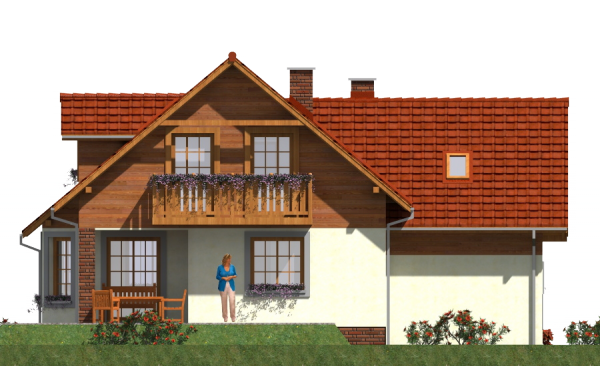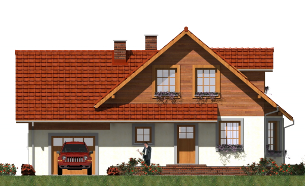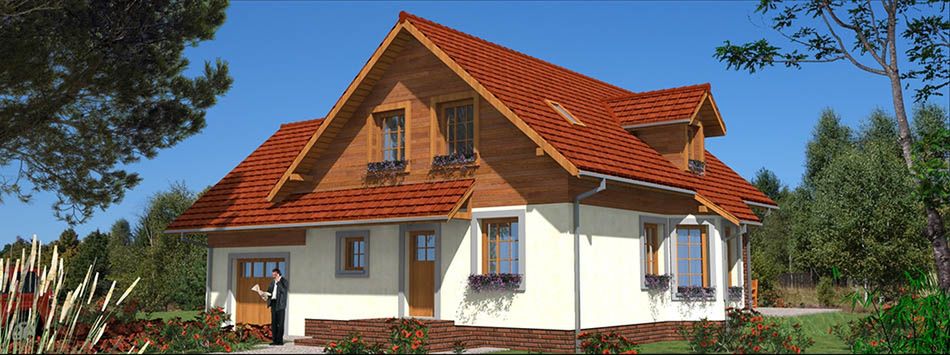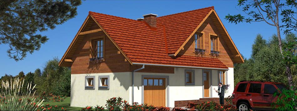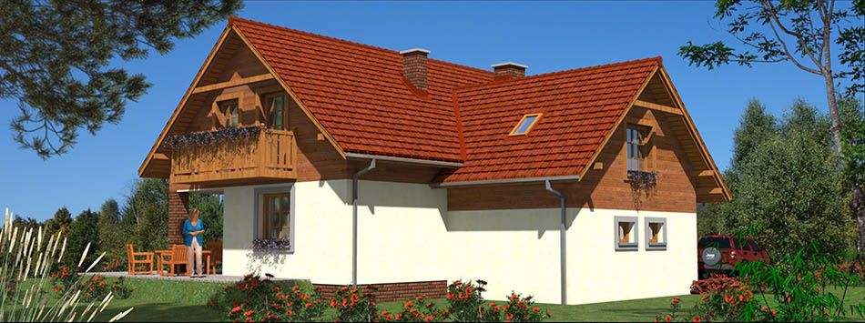 Graficzne opracowanie rzutów poglądowych widocznych na karcie projektu zostało wykonane przez Extradom.pl. Prezentowane przez Extradom.pl wizualizacje wykonane zostały przez autora projektu i należy poczytywać je jedynie za przykład i propozycję wykończenia, wizję architektoniczną autora projektu. Ostateczne wykończenie budynku może nastąpić na wiele sposobów. Szczegółowe rozwiązania zastosowane w oferowanej dokumentacji - w tym również ilość, lokalizacje i wygląd okien, drzwi, kominów - mogą w niewielkim stopniu różnić się od prezentowanej wizualizacji budynku.