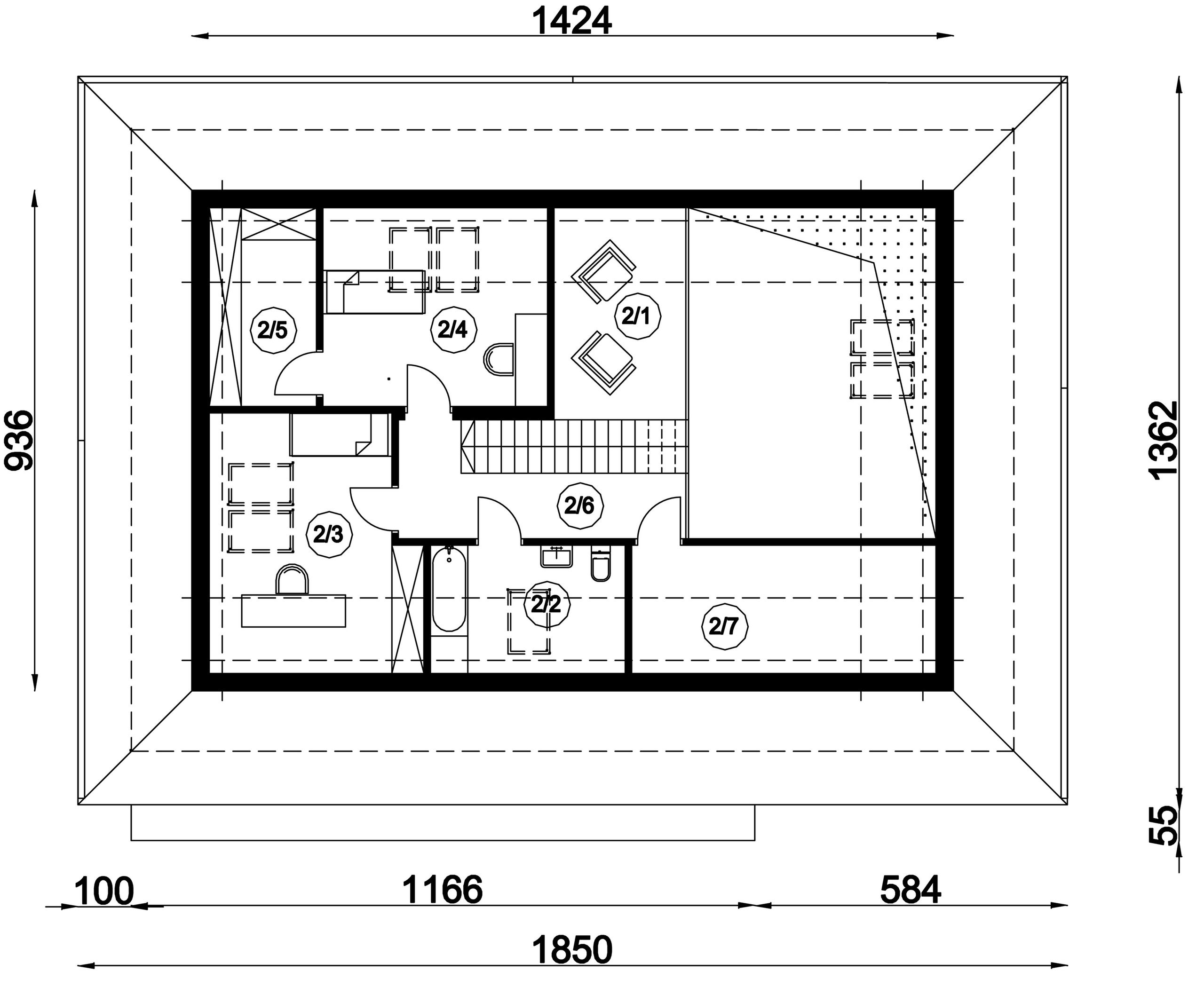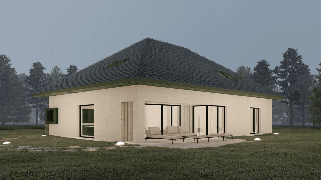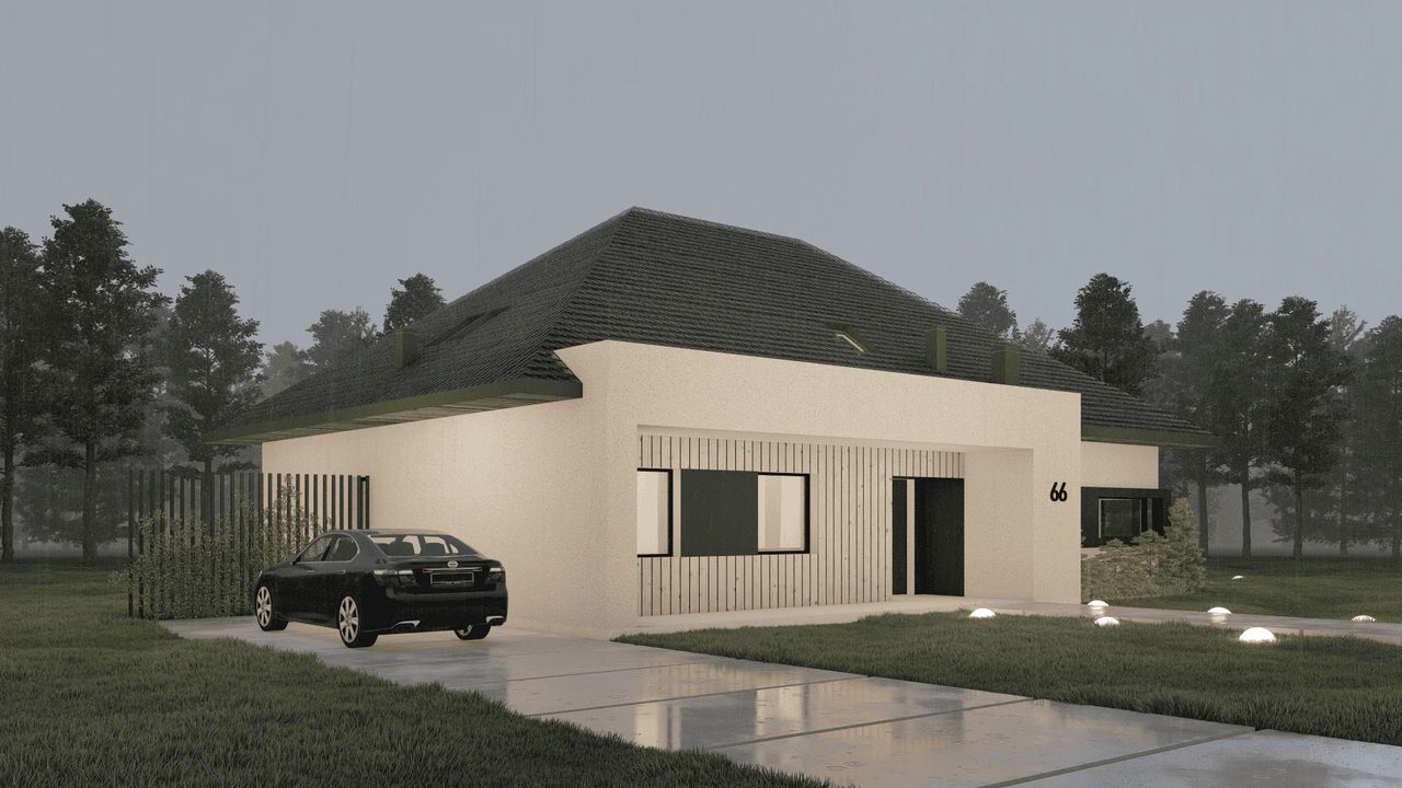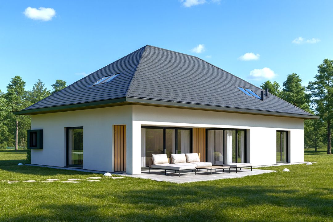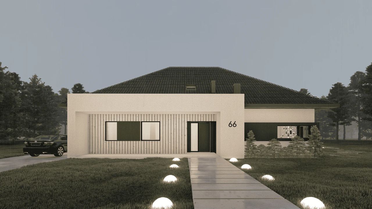 Graficzne opracowanie rzutów poglądowych widocznych na karcie projektu zostało wykonane przez Extradom.pl. Prezentowane przez Extradom.pl wizualizacje wykonane zostały przez autora projektu i należy poczytywać je jedynie za przykład i propozycję wykończenia, wizję architektoniczną autora projektu. Ostateczne wykończenie budynku może nastąpić na wiele sposobów. Szczegółowe rozwiązania zastosowane w oferowanej dokumentacji - w tym również ilość, lokalizacje i wygląd okien, drzwi, kominów - mogą w niewielkim stopniu różnić się od prezentowanej wizualizacji budynku.