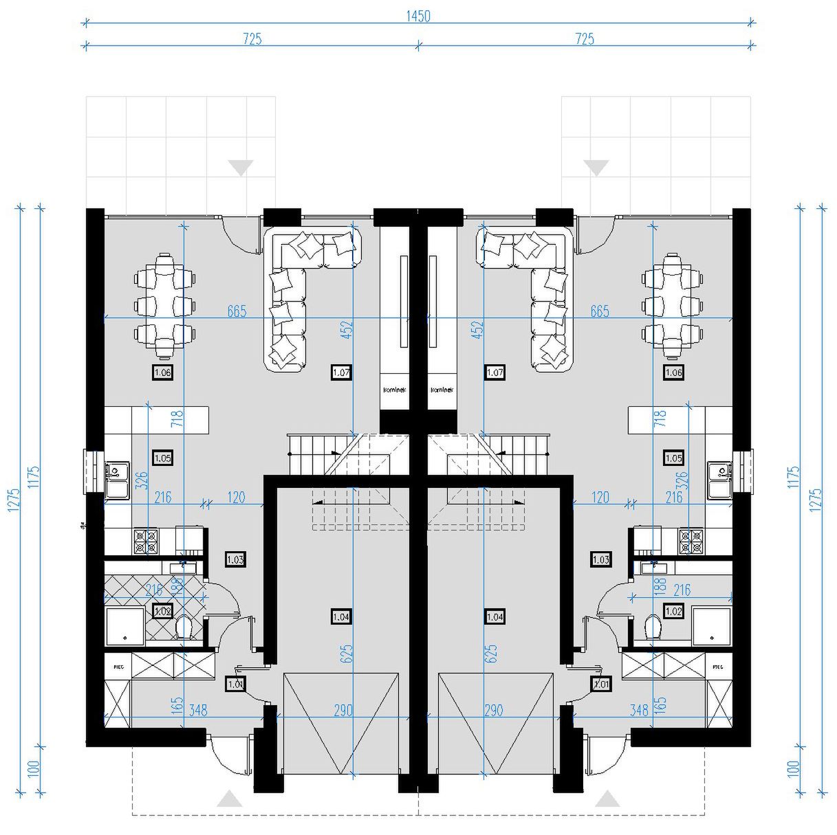 Graficzne opracowanie rzutów poglądowych widocznych na karcie projektu zostało wykonane przez Extradom.pl. Prezentowane przez Extradom.pl wizualizacje wykonane zostały przez autora projektu i należy poczytywać je jedynie za przykład i propozycję wykończenia, wizję architektoniczną autora projektu. Ostateczne wykończenie budynku może nastąpić na wiele sposobów. Szczegółowe rozwiązania zastosowane w oferowanej dokumentacji - w tym również ilość, lokalizacje i wygląd okien, drzwi, kominów - mogą w niewielkim stopniu różnić się od prezentowanej wizualizacji budynku.