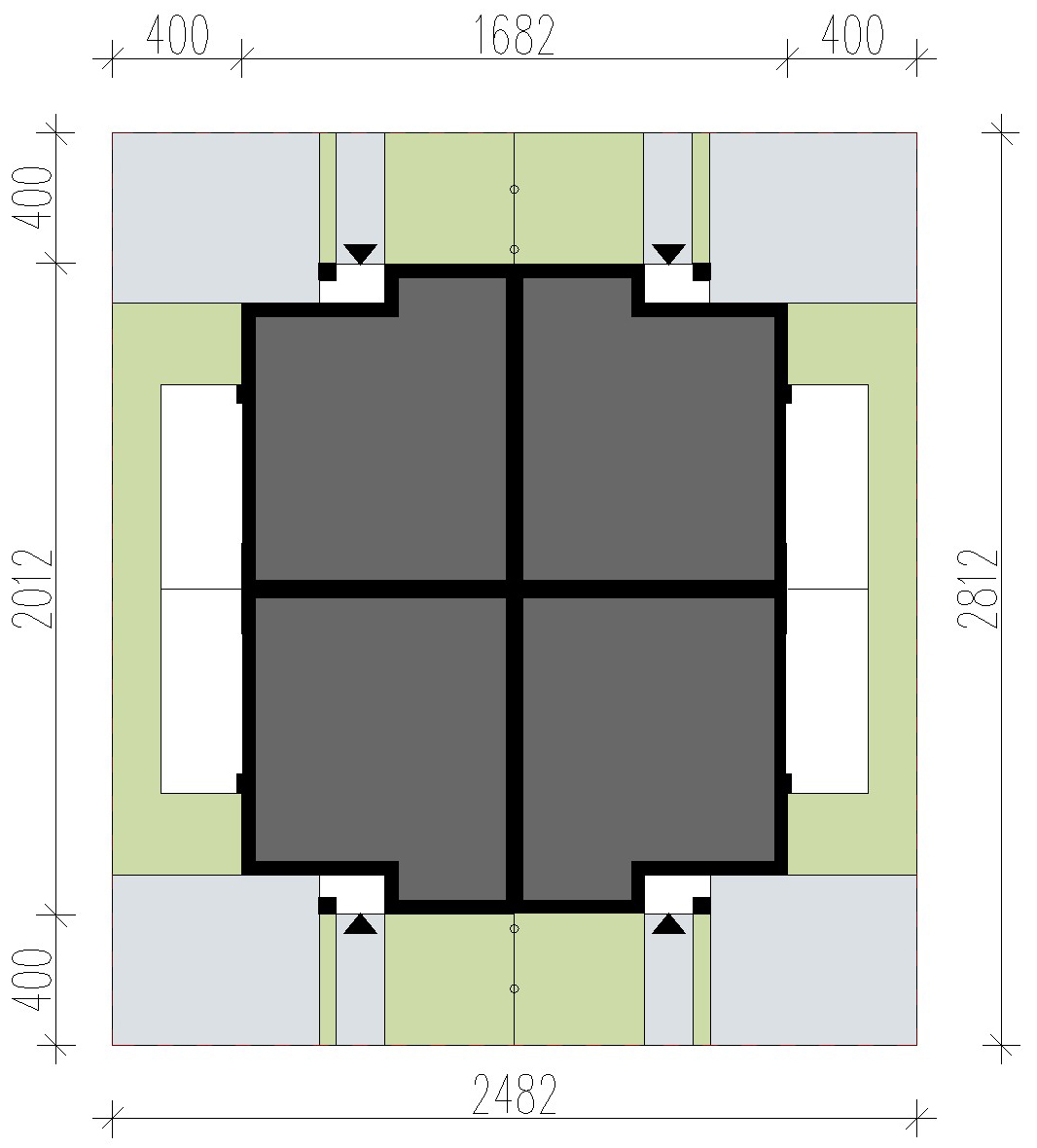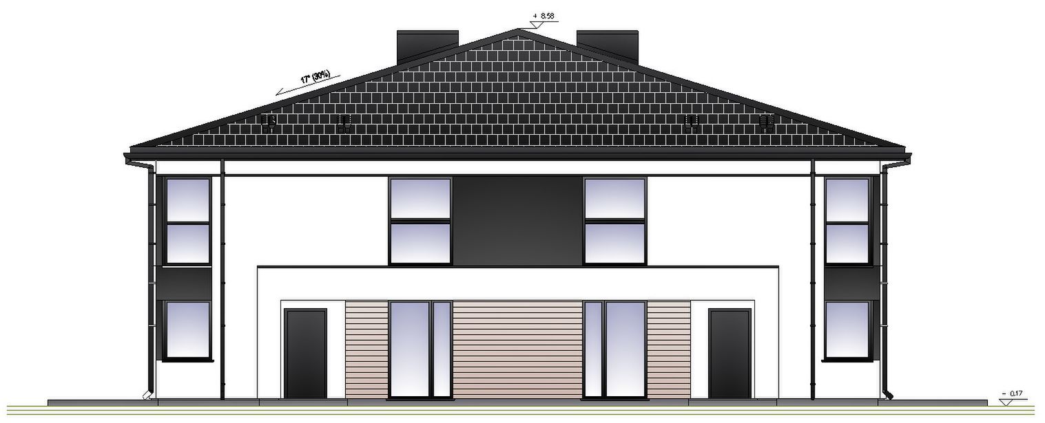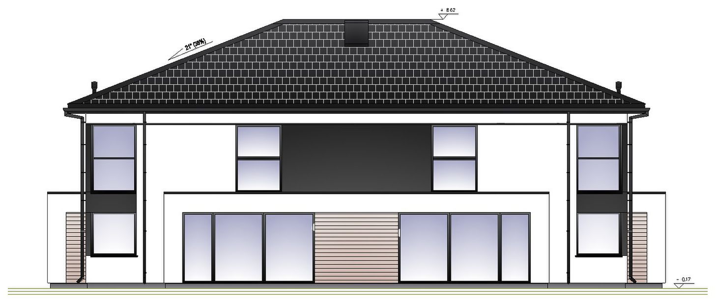 Nachylenia dachu głównego: 17˚ i 21˚; Posadowienie budynku: płyta fundamentowa; Ściany zewnętrzne: z bloczków silikatowych grubości 25cm na zaprawie cementowo-wapiennej lub pustaków ceramicznych PHOROTHERM grubości 25cm na klej + styropian 15cm-20cm + tynk cienkowarstwowy mineralny; Ściany wewnętrzne: nośne-z bloczków silikatowych grubości 25cm na zaprawie cementowo-wapiennej lub pustaków ceramicznych PHOROTHERM grubości 25cm + tynk obustronnie działowe-murowane: pustak gazobetonowy 12 cm + tynk obustronnie; Strop nad parterem: płyta żelbetowa 15 cm + folia paroizolacyjna + styropian posadzkowy 5-7 cm + szlichta betonowa 5-6 cm + wykończenie podłogi; Konstrukcja dachu: czterospadowy, układ krokwiowo - płatwiowy; Pokrycie dach: blachodachówka; Elewacja: tynk cienkowarstwowy w kolorze białym i antracytowym,na fragmentach ścian deska elewacyjna;
