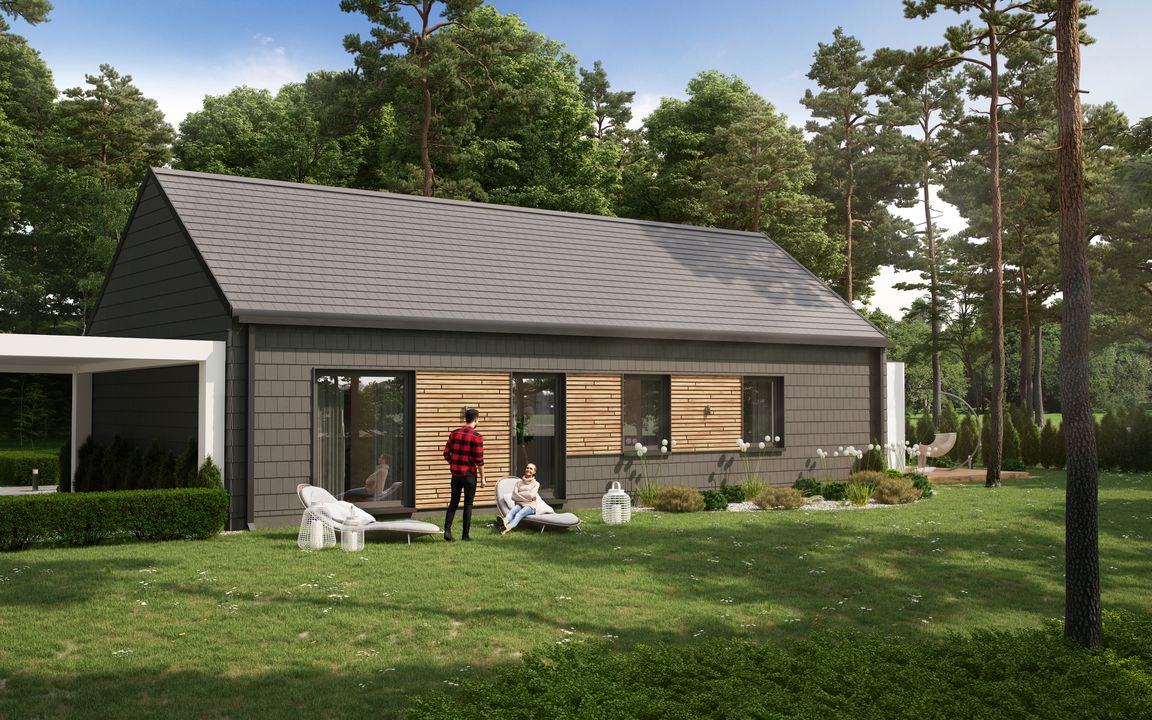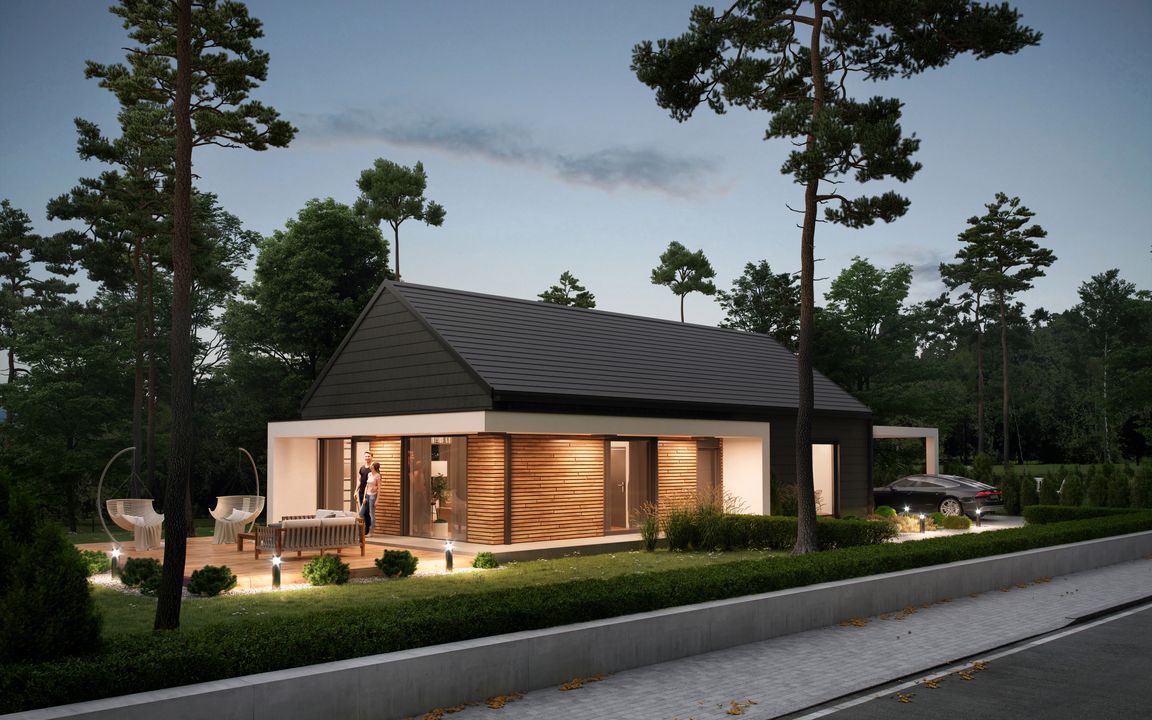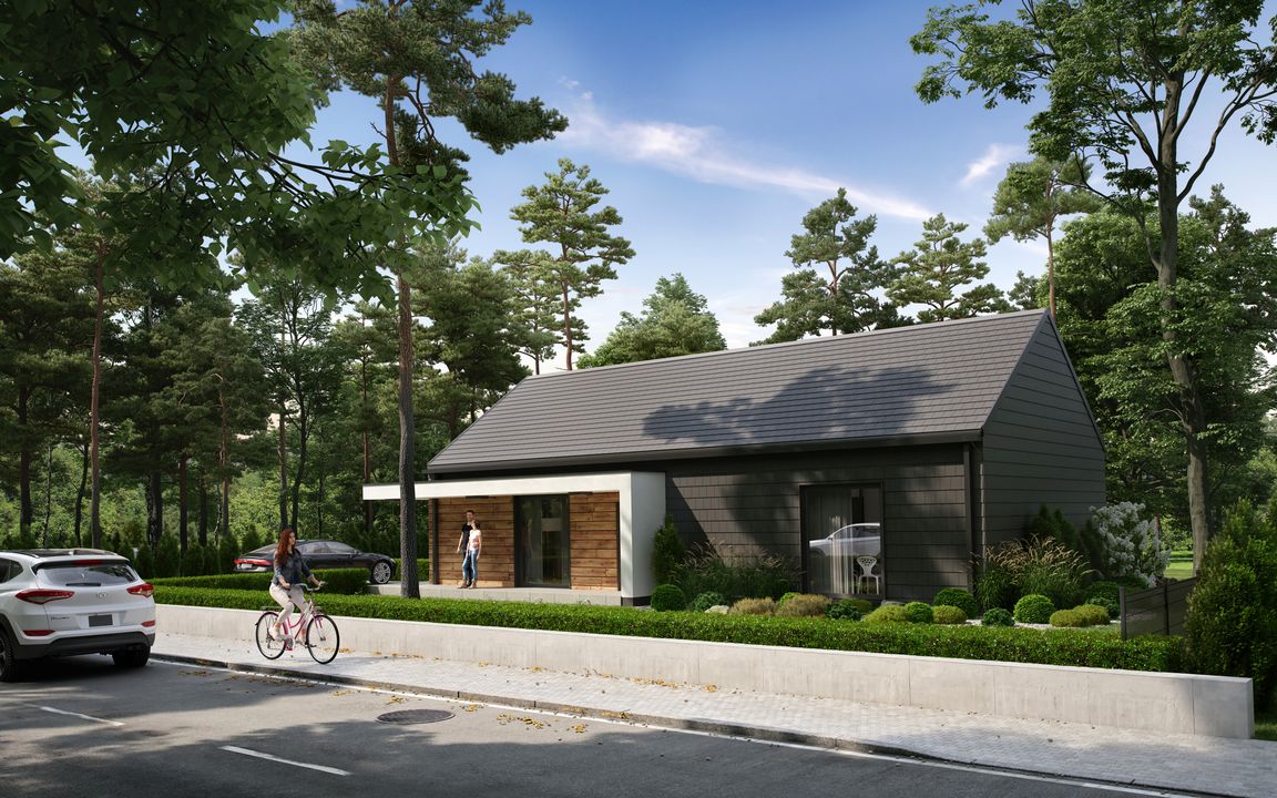 Graficzne opracowanie rzutów poglądowych widocznych na karcie projektu zostało wykonane przez Extradom.pl. Prezentowane przez Extradom.pl wizualizacje wykonane zostały przez autora projektu i należy poczytywać je jedynie za przykład i propozycję wykończenia, wizję architektoniczną autora projektu. Ostateczne wykończenie budynku może nastąpić na wiele sposobów. Szczegółowe rozwiązania zastosowane w oferowanej dokumentacji - w tym również ilość, lokalizacje i wygląd okien, drzwi, kominów - mogą w niewielkim stopniu różnić się od prezentowanej wizualizacji budynku.