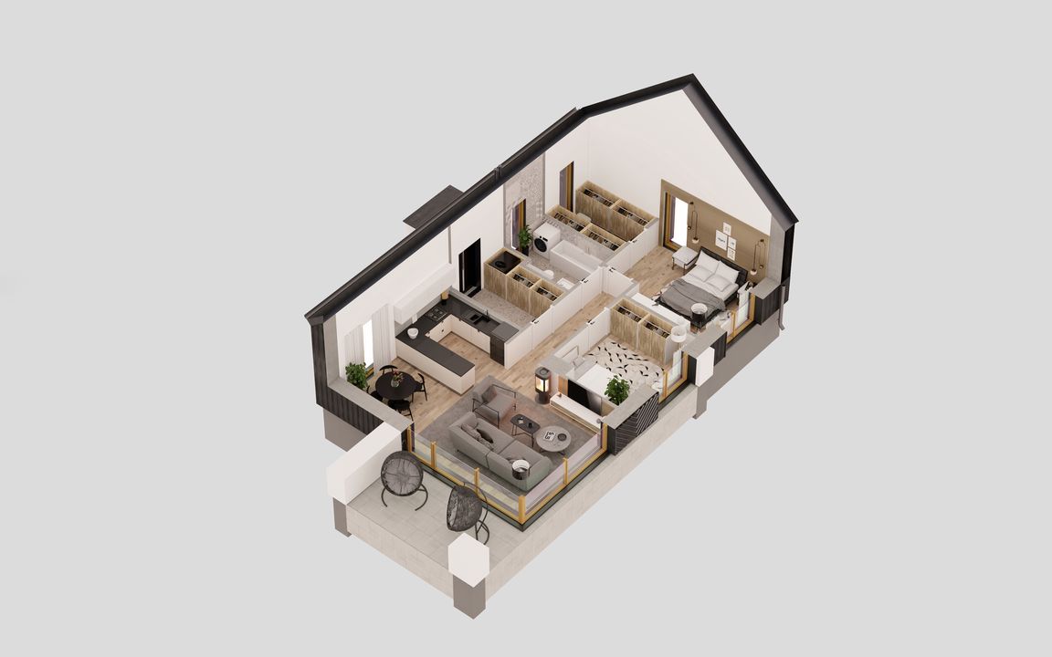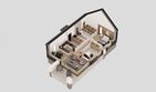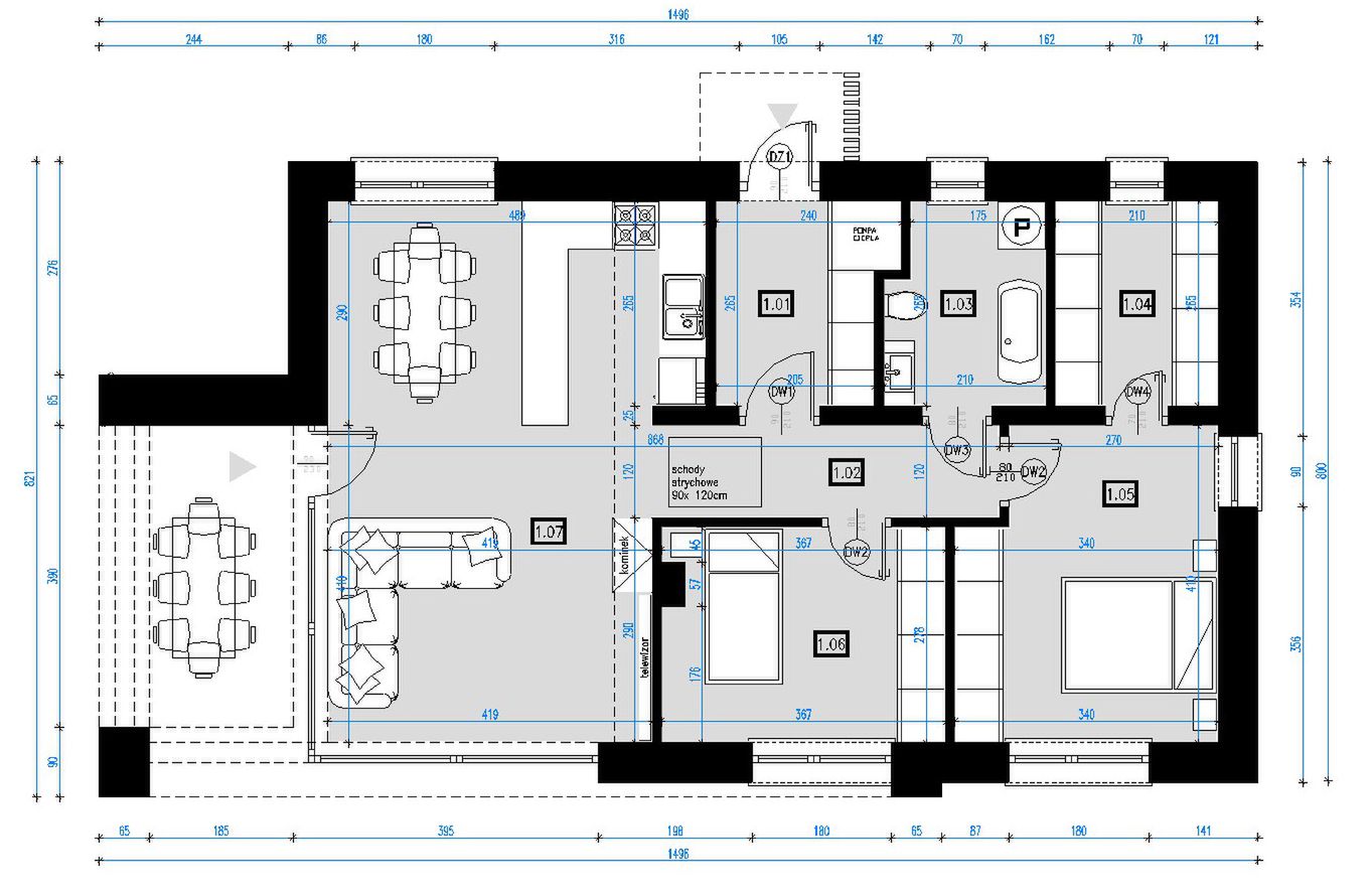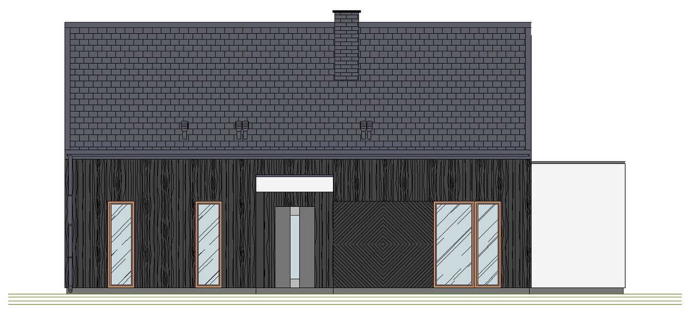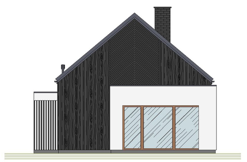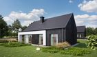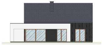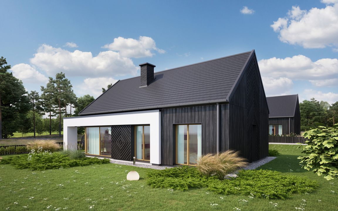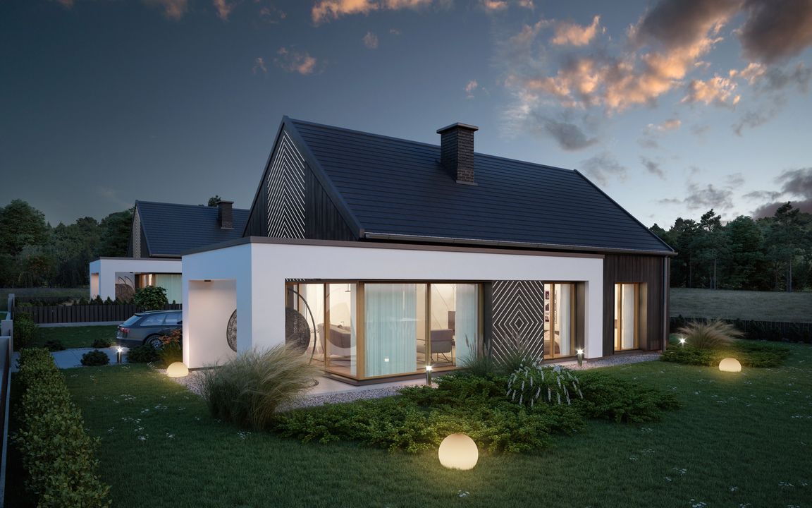 Graficzne opracowanie rzutów poglądowych widocznych na karcie projektu zostało wykonane przez Extradom.pl. Prezentowane przez Extradom.pl wizualizacje wykonane zostały przez autora projektu i należy poczytywać je jedynie za przykład i propozycję wykończenia, wizję architektoniczną autora projektu. Ostateczne wykończenie budynku może nastąpić na wiele sposobów. Szczegółowe rozwiązania zastosowane w oferowanej dokumentacji - w tym również ilość, lokalizacje i wygląd okien, drzwi, kominów - mogą w niewielkim stopniu różnić się od prezentowanej wizualizacji budynku.