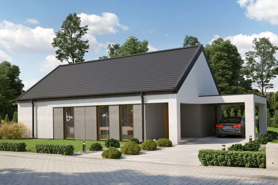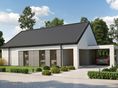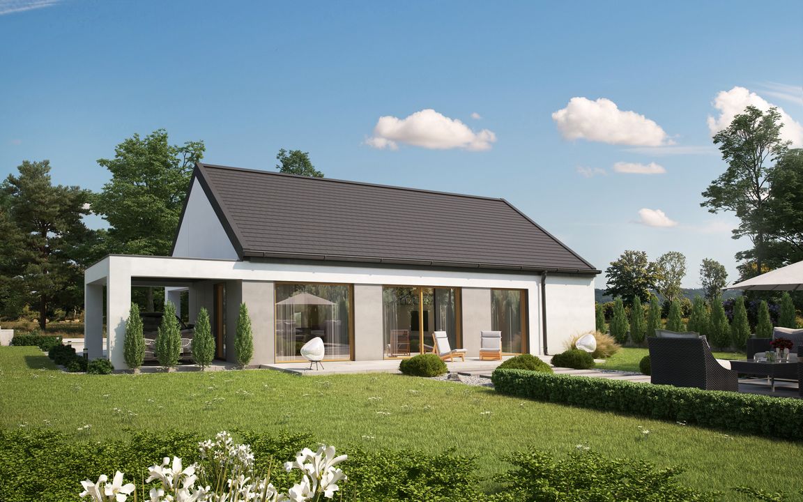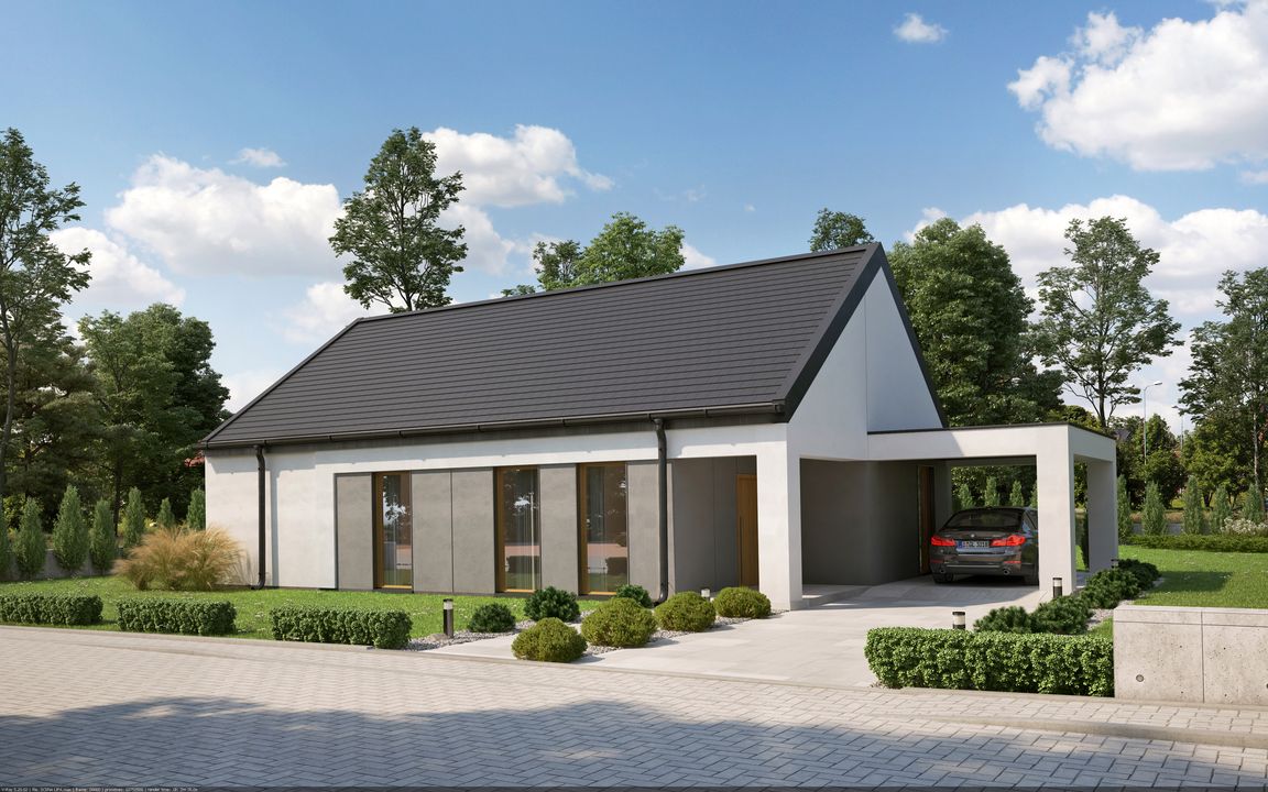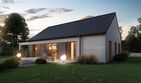 Graficzne opracowanie rzutów poglądowych widocznych na karcie projektu zostało wykonane przez Extradom.pl. Prezentowane przez Extradom.pl wizualizacje wykonane zostały przez autora projektu i należy poczytywać je jedynie za przykład i propozycję wykończenia, wizję architektoniczną autora projektu. Ostateczne wykończenie budynku może nastąpić na wiele sposobów. Szczegółowe rozwiązania zastosowane w oferowanej dokumentacji - w tym również ilość, lokalizacje i wygląd okien, drzwi, kominów - mogą w niewielkim stopniu różnić się od prezentowanej wizualizacji budynku.