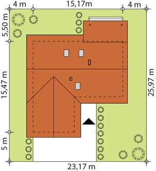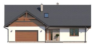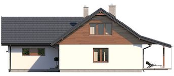 Graficzne opracowanie rzutów poglądowych widocznych na karcie projektu zostało wykonane przez Extradom.pl. Prezentowane przez Extradom.pl wizualizacje wykonane zostały przez autora projektu i należy poczytywać je jedynie za przykład i propozycję wykończenia, wizję architektoniczną autora projektu. Ostateczne wykończenie budynku może nastąpić na wiele sposobów. Szczegółowe rozwiązania zastosowane w oferowanej dokumentacji - w tym również ilość, lokalizacje i wygląd okien, drzwi, kominów - mogą w niewielkim stopniu różnić się od prezentowanej wizualizacji budynku.
