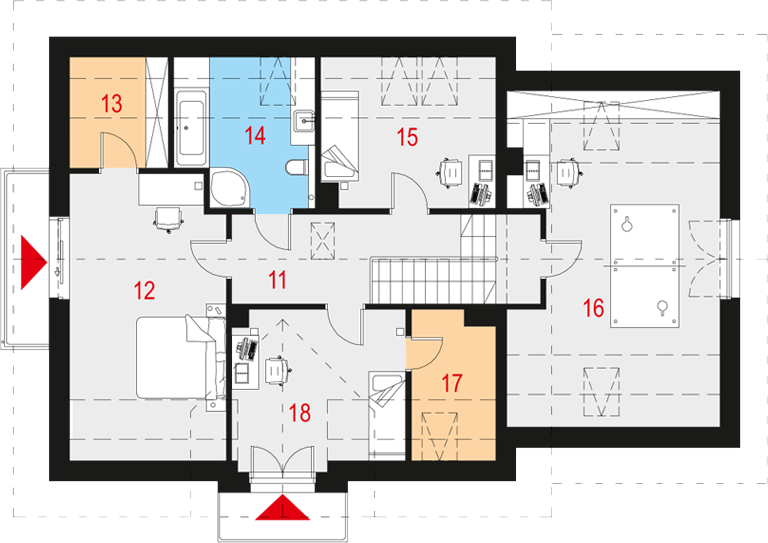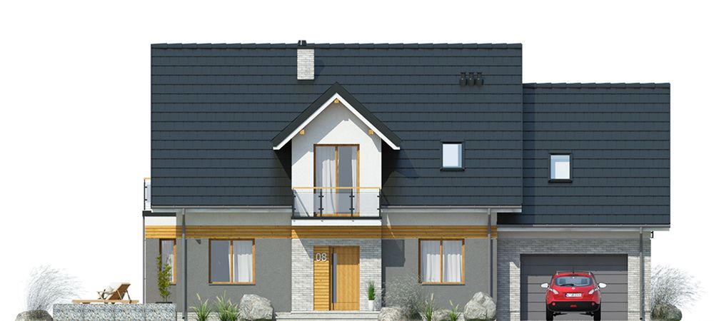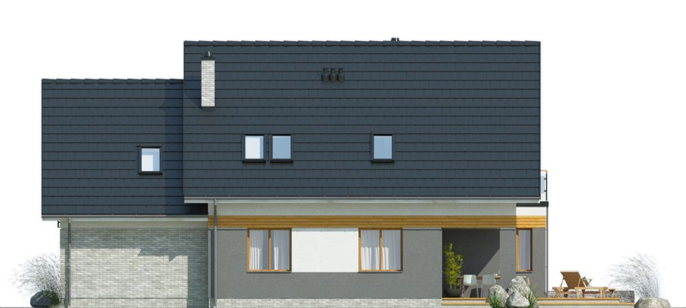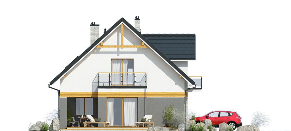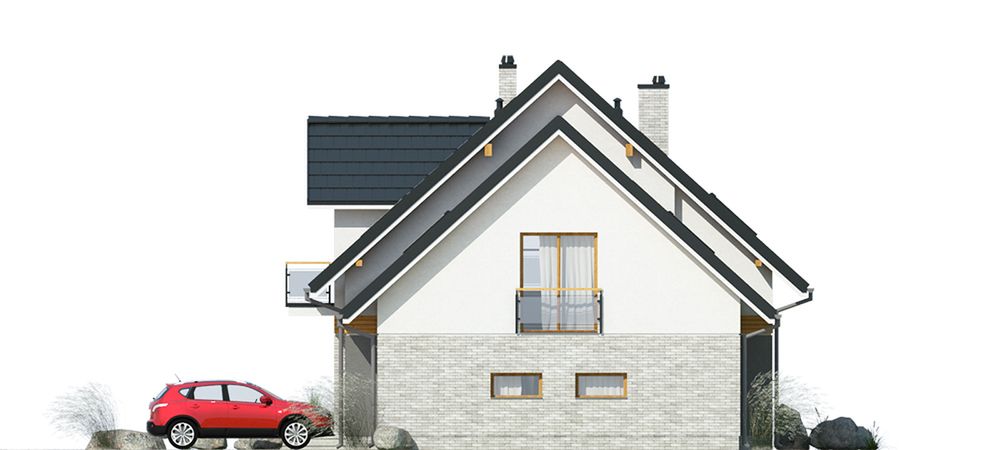Graficzne opracowanie rzutów poglądowych widocznych na karcie projektu zostało wykonane przez Extradom.pl. Prezentowane przez Extradom.pl wizualizacje wykonane zostały przez autora projektu i należy poczytywać je jedynie za przykład i propozycję wykończenia, wizję architektoniczną autora projektu. Ostateczne wykończenie budynku może nastąpić na wiele sposobów. Szczegółowe rozwiązania zastosowane w oferowanej dokumentacji - w tym również ilość, lokalizacje i wygląd okien, drzwi, kominów - mogą w niewielkim stopniu różnić się od prezentowanej wizualizacji budynku.