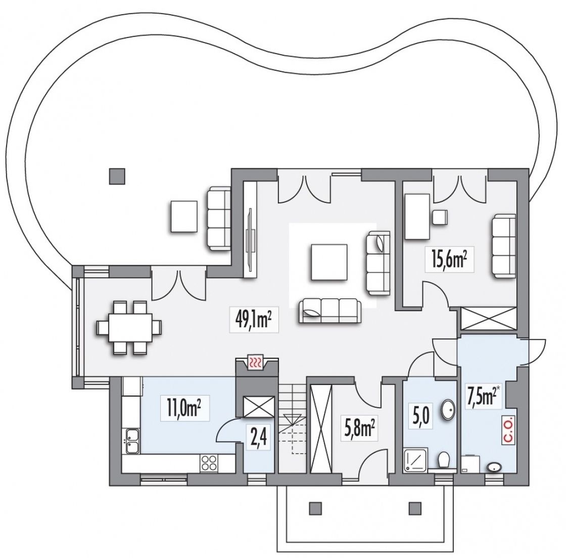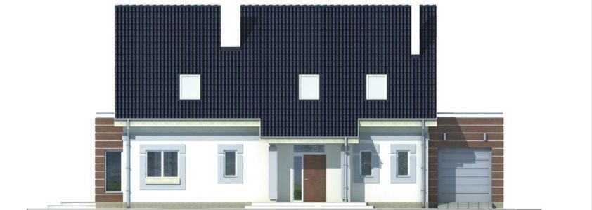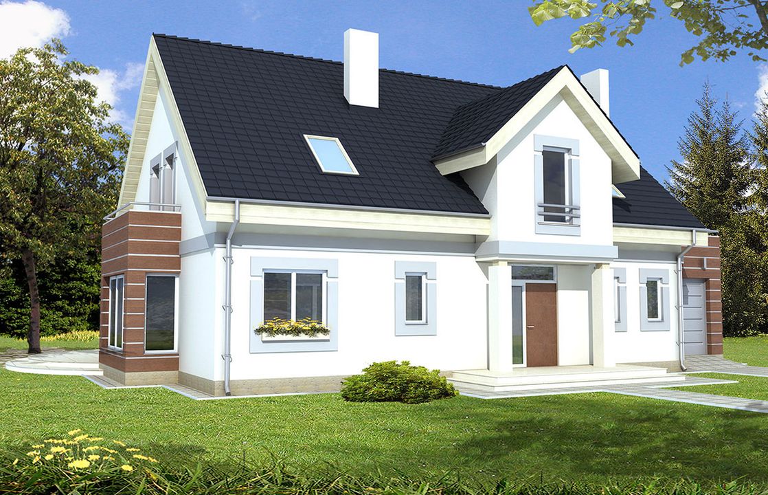 Graficzne opracowanie rzutów poglądowych widocznych na karcie projektu zostało wykonane przez Extradom.pl. Prezentowane przez Extradom.pl wizualizacje wykonane zostały przez autora projektu i należy poczytywać je jedynie za przykład i propozycję wykończenia, wizję architektoniczną autora projektu. Ostateczne wykończenie budynku może nastąpić na wiele sposobów. Szczegółowe rozwiązania zastosowane w oferowanej dokumentacji - w tym również ilość, lokalizacje i wygląd okien, drzwi, kominów - mogą w niewielkim stopniu różnić się od prezentowanej wizualizacji budynku.
