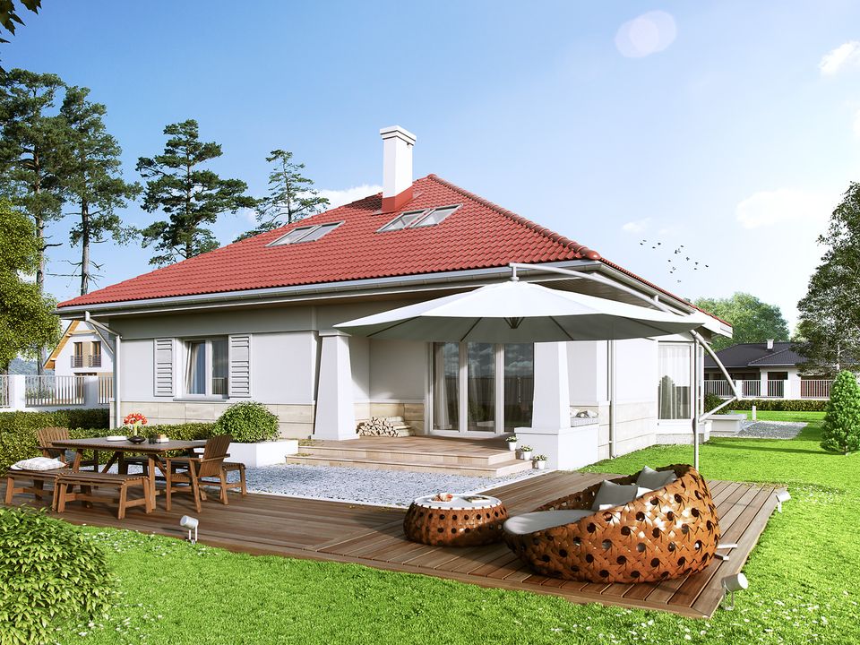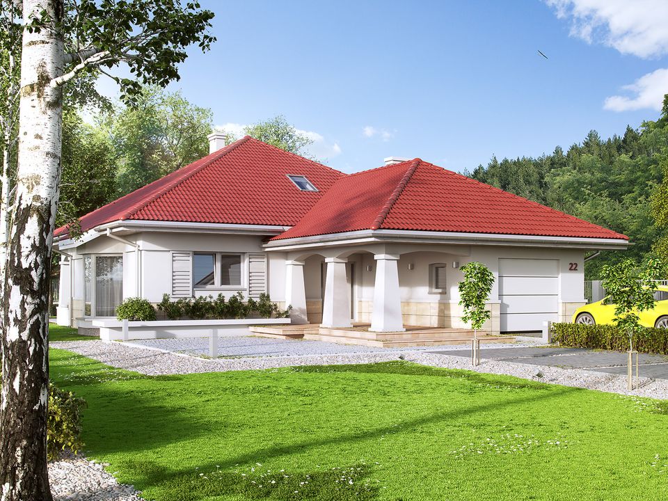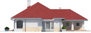 Graficzne opracowanie rzutów poglądowych widocznych na karcie projektu zostało wykonane przez Extradom.pl. Prezentowane przez Extradom.pl wizualizacje wykonane zostały przez autora projektu i należy poczytywać je jedynie za przykład i propozycję wykończenia, wizję architektoniczną autora projektu. Ostateczne wykończenie budynku może nastąpić na wiele sposobów. Szczegółowe rozwiązania zastosowane w oferowanej dokumentacji - w tym również ilość, lokalizacje i wygląd okien, drzwi, kominów - mogą w niewielkim stopniu różnić się od prezentowanej wizualizacji budynku.