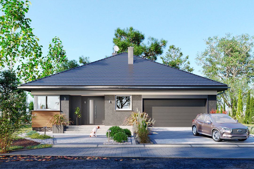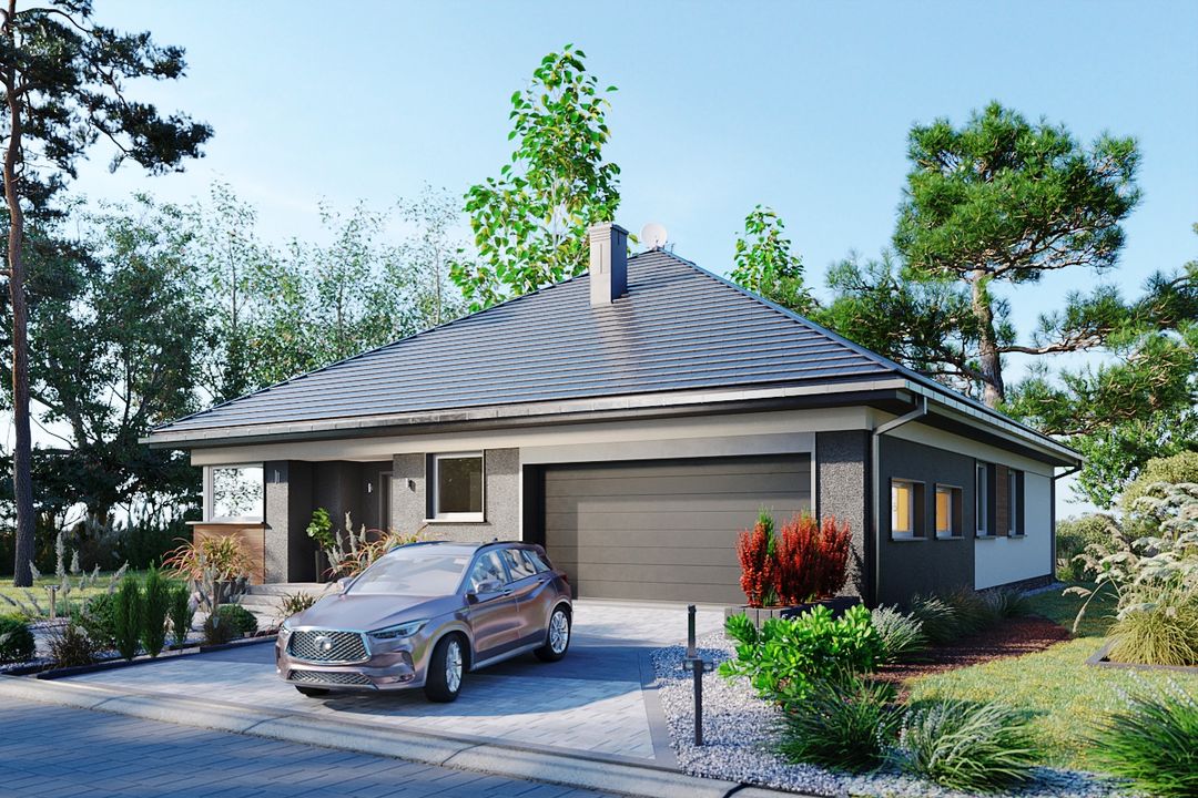 Graficzne opracowanie rzutów poglądowych widocznych na karcie projektu zostało wykonane przez Extradom.pl. Prezentowane przez Extradom.pl wizualizacje wykonane zostały przez autora projektu i należy poczytywać je jedynie za przykład i propozycję wykończenia, wizję architektoniczną autora projektu. Ostateczne wykończenie budynku może nastąpić na wiele sposobów. Szczegółowe rozwiązania zastosowane w oferowanej dokumentacji - w tym również ilość, lokalizacje i wygląd okien, drzwi, kominów - mogą w niewielkim stopniu różnić się od prezentowanej wizualizacji budynku.