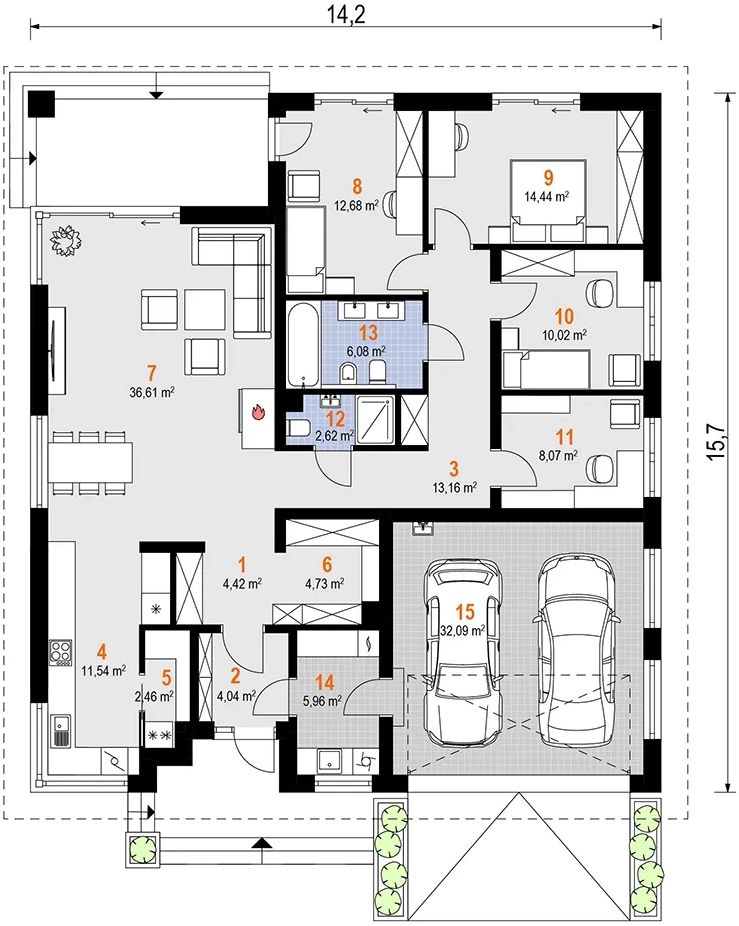 Wersja technologiczna: murowana - beton komórkowy. Konstrukcja dachu: prefabrykowane wiązary drewniane MITEK Industries Polska. Pokrycie dachowe: dachówka. Strop: dolny pas wiązarów MITEK. Typ schodów: brak. Typ ogrzewania: Kocioł na gaz KOCIOŁ gazowy VIESSMANN POMPA CIEPŁA VIESSMANN. Dostępna wersja z paliwem gazowym: Tak. Dostępna wersja z pompą ciepła: Tak. Dostępna wersja z fotowoltaiką: Tak. Wentylacja: mechaniczna. Izolacja termiczna ścian zewnętrznych: Termo Organika TERMONIUM FASADA. Ściany zewnętrzne: 24 cm beton komórkowy Solbet Optimal. Ściany wewnętrzne: 24 cm beton komórkowy Solbet Optimal. Ściany wewnętrzne działowe: 12 cm beton komórkowy Solbet One. Wentylacja: mechaniczna Heatpex Aria.