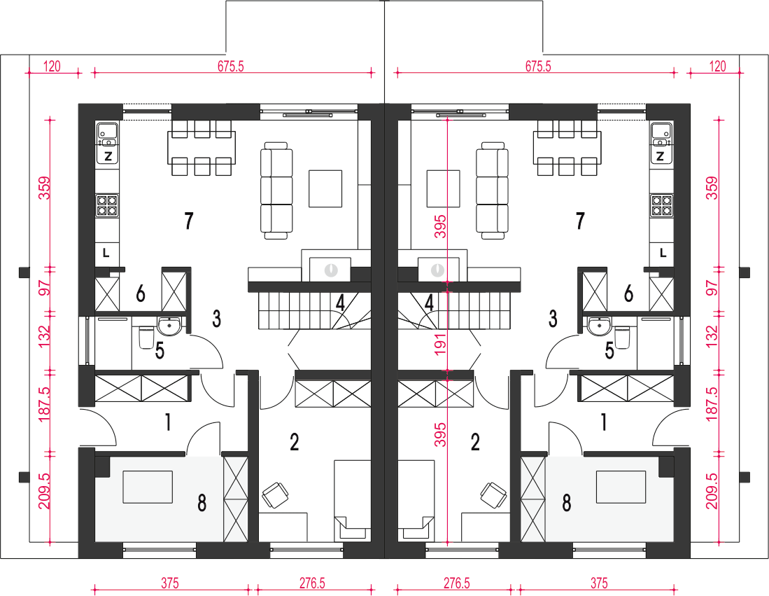 Projekt jest w fazie koncepcji. Przy zakupie projektu należy zapłacić 50% zaliczki. Zaliczka jest bezzwrotna w przypadku zwrotu lub rezygnacji z zamówienia. Budynek dwulokalowy posadowiony na wspólnym fundamencie. Jeśli planujesz budowę na osobnych działkach zamów pojedyncze segmenty: podstawa + lustro.