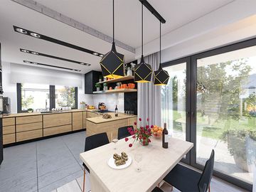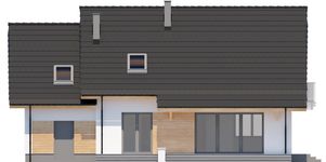 Graficzne opracowanie rzutów poglądowych widocznych na karcie projektu zostało wykonane przez Extradom.pl. Prezentowane przez Extradom.pl wizualizacje wykonane zostały przez autora projektu i należy poczytywać je jedynie za przykład i propozycję wykończenia, wizję architektoniczną autora projektu. Ostateczne wykończenie budynku może nastąpić na wiele sposobów. Szczegółowe rozwiązania zastosowane w oferowanej dokumentacji - w tym również ilość, lokalizacje i wygląd okien, drzwi, kominów - mogą w niewielkim stopniu różnić się od prezentowanej wizualizacji budynku.
