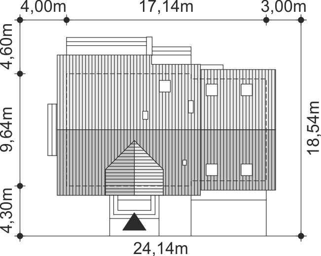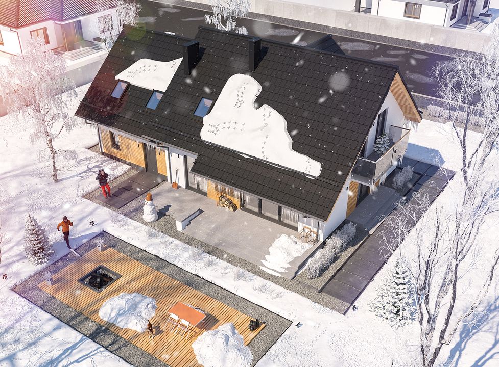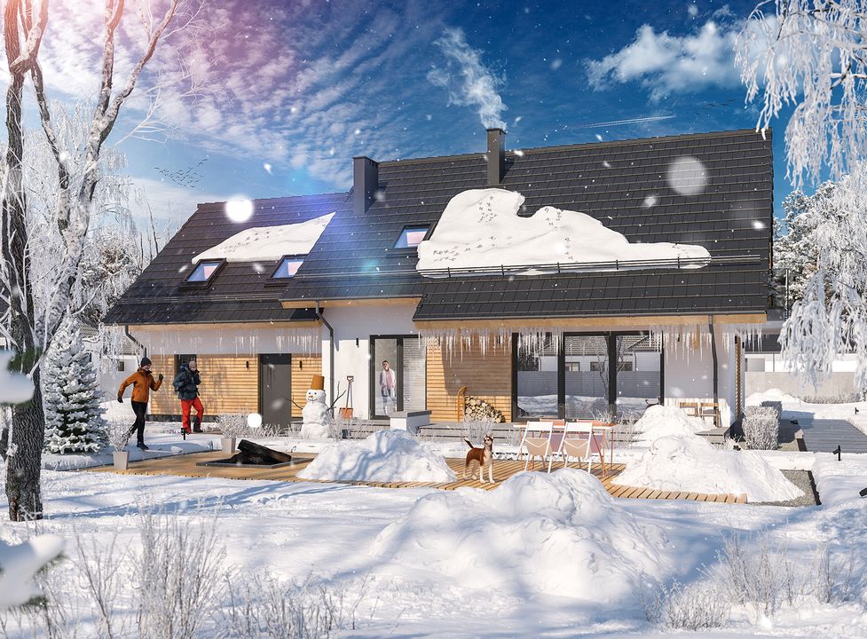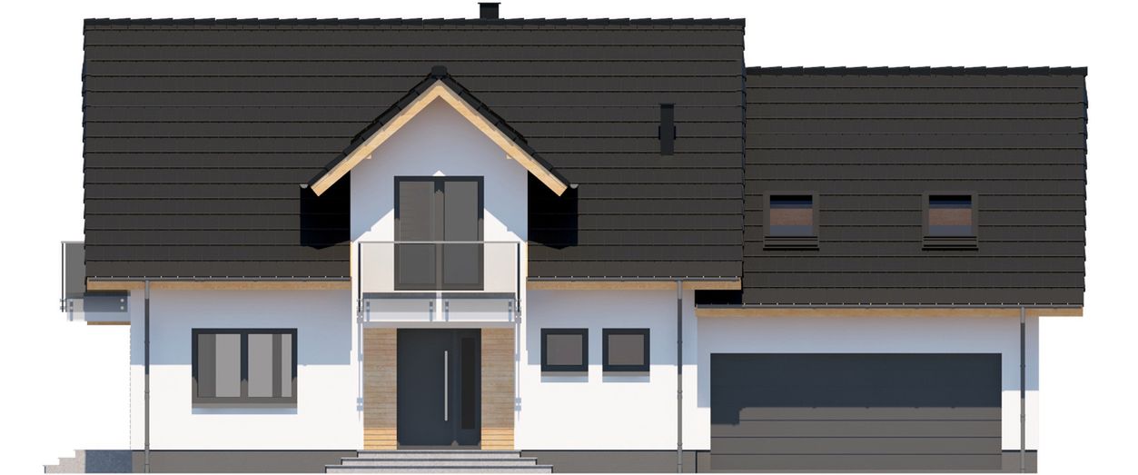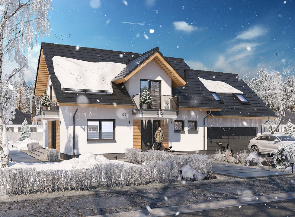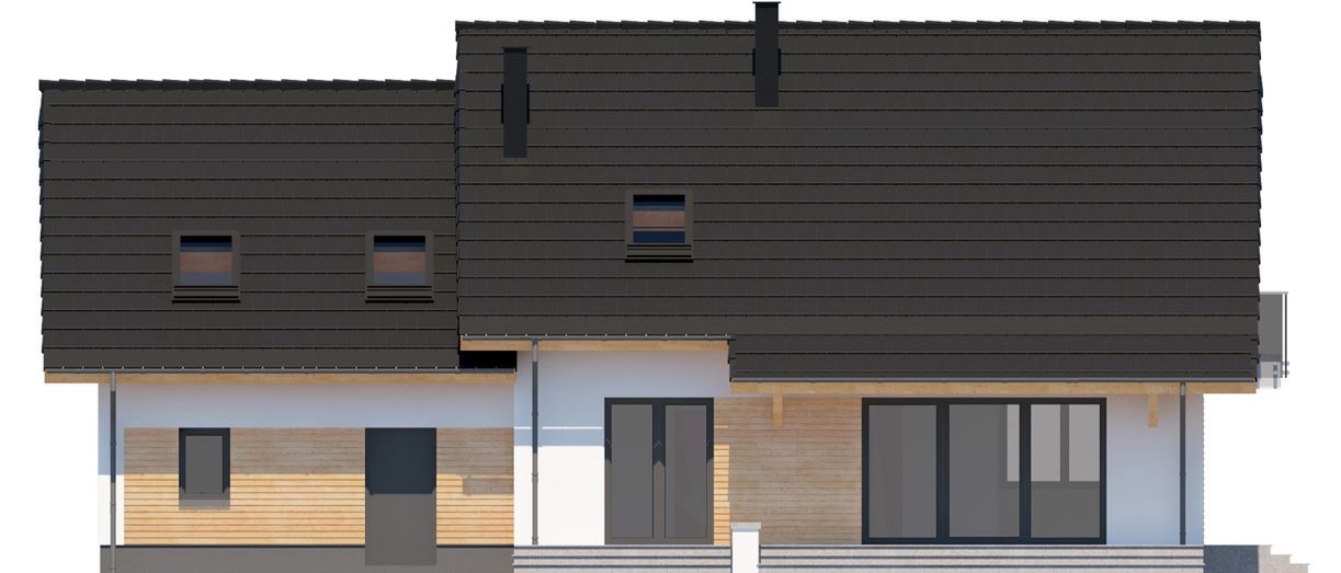 Graficzne opracowanie rzutów poglądowych widocznych na karcie projektu zostało wykonane przez Extradom.pl. Prezentowane przez Extradom.pl wizualizacje wykonane zostały przez autora projektu i należy poczytywać je jedynie za przykład i propozycję wykończenia, wizję architektoniczną autora projektu. Ostateczne wykończenie budynku może nastąpić na wiele sposobów. Szczegółowe rozwiązania zastosowane w oferowanej dokumentacji - w tym również ilość, lokalizacje i wygląd okien, drzwi, kominów - mogą w niewielkim stopniu różnić się od prezentowanej wizualizacji budynku.