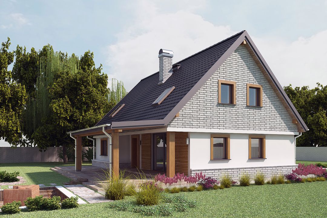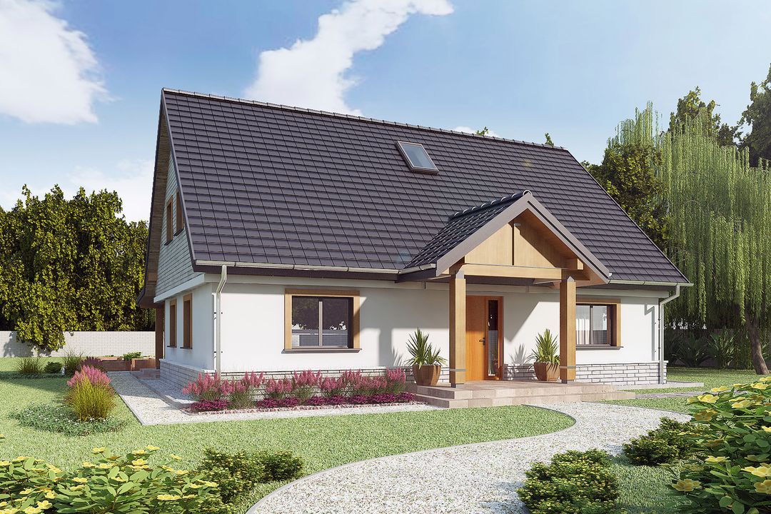 Dach: dwuspadowy, konstrukcja drewniana, dachówka ceramiczna płaska/prostokątna, ciemnoszara lub gont bitumiczny. Obróbki blacharskie z blachy powlekanej, tytan-cynk. Stropy: gęstożebrowe. Ściany: dwuwarstwowe - pustak ceramiczny + izolacja termiczna. Fundamenty: żelbetowe, ściany fundamentowe z bloczków betonowych. Elewacja: tynk strukturalny, cienkowarstwowy, okładzina drewniana. Stolarka zewnętrzna: PVC, lub aluminiowa, lub drewniana w kolorze jasnego drewna.