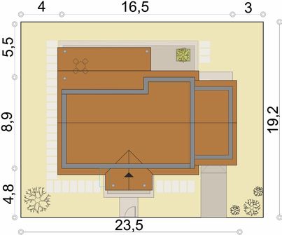 Graficzne opracowanie rzutów poglądowych widocznych na karcie projektu zostało wykonane przez Extradom.pl. Prezentowane przez Extradom.pl wizualizacje wykonane zostały przez autora projektu i należy poczytywać je jedynie za przykład i propozycję wykończenia, wizję architektoniczną autora projektu. Ostateczne wykończenie budynku może nastąpić na wiele sposobów. Szczegółowe rozwiązania zastosowane w oferowanej dokumentacji - w tym również ilość, lokalizacje i wygląd okien, drzwi, kominów - mogą w niewielkim stopniu różnić się od prezentowanej wizualizacji budynku.