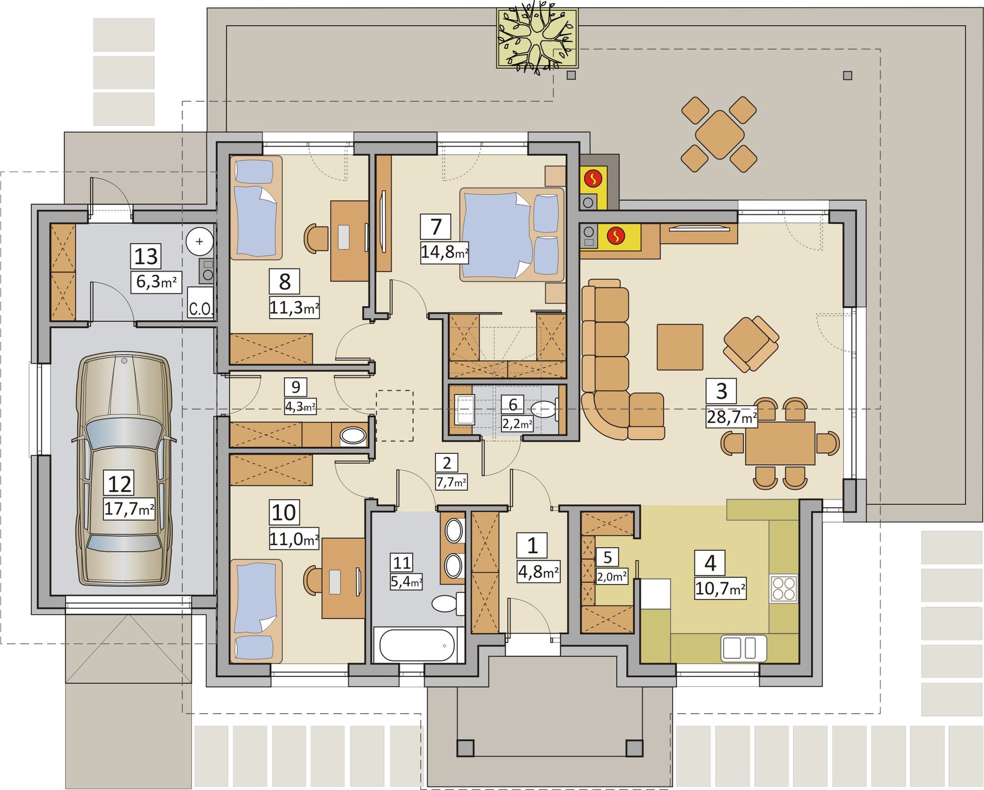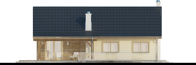 Graficzne opracowanie rzutów poglądowych widocznych na karcie projektu zostało wykonane przez Extradom.pl. Prezentowane przez Extradom.pl wizualizacje wykonane zostały przez autora projektu i należy poczytywać je jedynie za przykład i propozycję wykończenia, wizję architektoniczną autora projektu. Ostateczne wykończenie budynku może nastąpić na wiele sposobów. Szczegółowe rozwiązania zastosowane w oferowanej dokumentacji - w tym również ilość, lokalizacje i wygląd okien, drzwi, kominów - mogą w niewielkim stopniu różnić się od prezentowanej wizualizacji budynku.