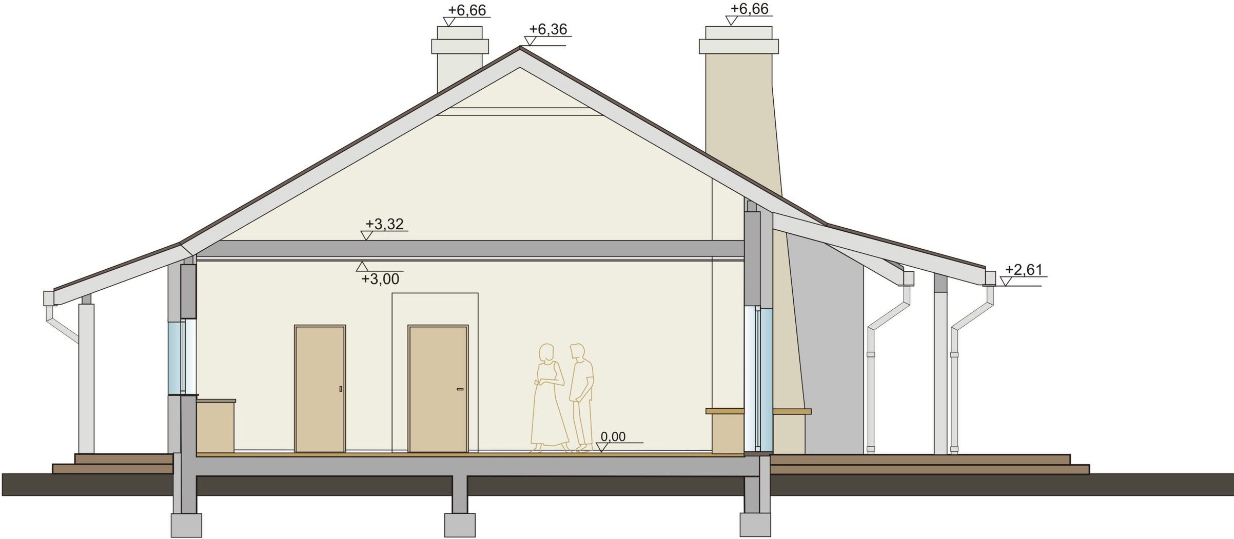 Dach: dwuspadowy, konstrukcja drewniana, dachówka ceramiczna płaska/prostokątna, ciemnoszara lub gont bitumiczny. Obróbki blacharskie z blachy powlekanej, tytan-cynk. Stropy: gęstożebrowe lub zamiennie drewniany. Ściany: dwuwarstwowe - pustak ceramiczny + izolacja termiczna. Fundamenty: żelbetowe, ściany fundamentowe z bloczków betonowych. Elewacja: tynk strukturalny, cienkowarstwowy, okładzina drewniana. Stolarka zewnętrzna: PVC, lub aluminiowa, lub drewniana w kolorze jasnego drewna.