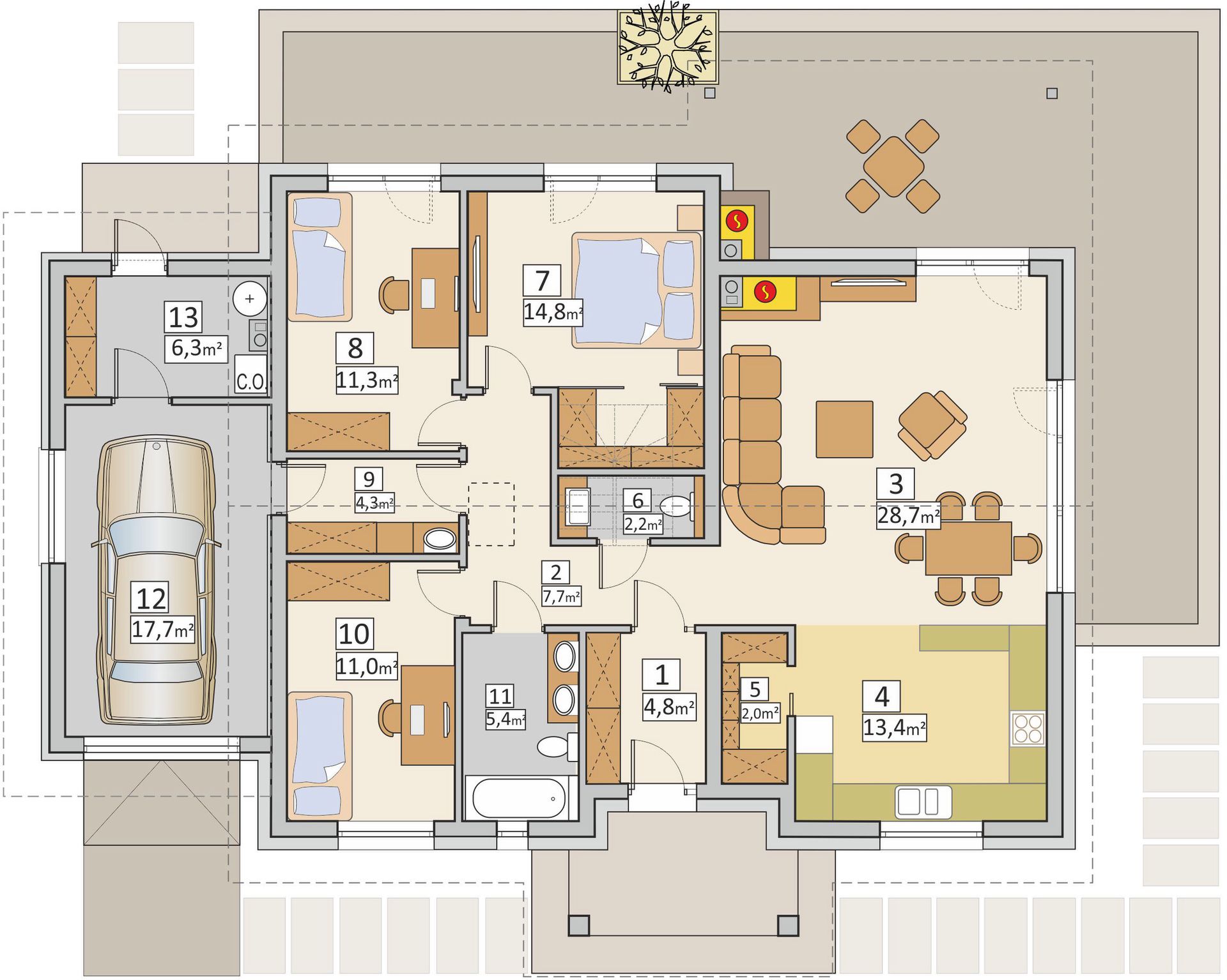 Graficzne opracowanie rzutów poglądowych widocznych na karcie projektu zostało wykonane przez Extradom.pl. Prezentowane przez Extradom.pl wizualizacje wykonane zostały przez autora projektu i należy poczytywać je jedynie za przykład i propozycję wykończenia, wizję architektoniczną autora projektu. Ostateczne wykończenie budynku może nastąpić na wiele sposobów. Szczegółowe rozwiązania zastosowane w oferowanej dokumentacji - w tym również ilość, lokalizacje i wygląd okien, drzwi, kominów - mogą w niewielkim stopniu różnić się od prezentowanej wizualizacji budynku.