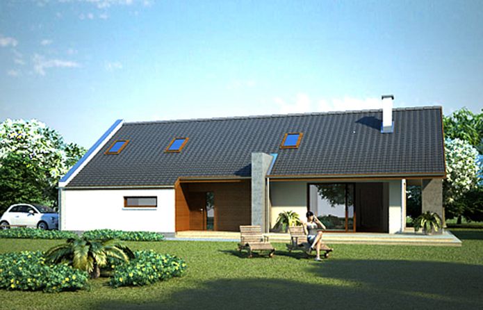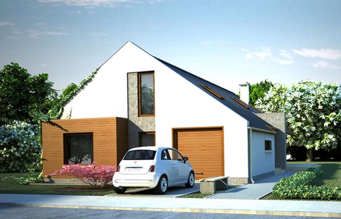 Dach: dwuspadowy, konstrukcja dachu drewniana, dachówka ceramiczna lub cementowa. Stropy: gęstożebrowe. Ściany: dwuwarstwowe pustak ceramiczny + izolacja termiczna. Fundamenty: żelbetowe, ściany fundamentowe z bloczków betonowych. Elewacja: tynk cienkowarstwowy, drewno elewacyjne, stolarka PCV lub drewniana.