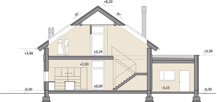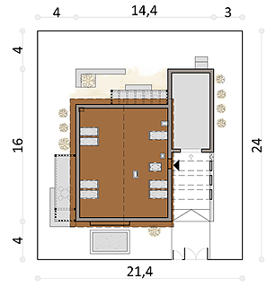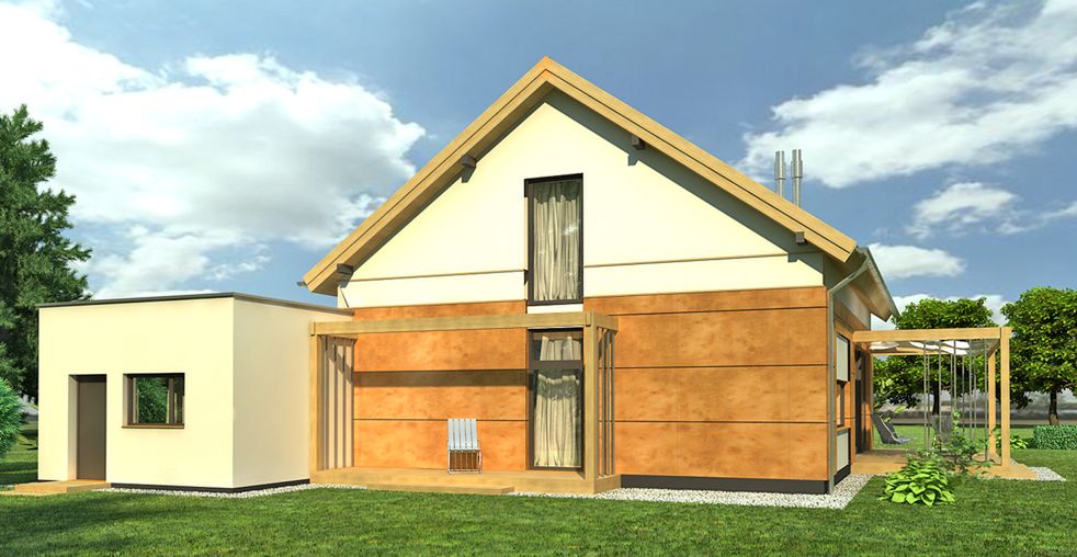 Graficzne opracowanie rzutów poglądowych widocznych na karcie projektu zostało wykonane przez Extradom.pl. Prezentowane przez Extradom.pl wizualizacje wykonane zostały przez autora projektu i należy poczytywać je jedynie za przykład i propozycję wykończenia, wizję architektoniczną autora projektu. Ostateczne wykończenie budynku może nastąpić na wiele sposobów. Szczegółowe rozwiązania zastosowane w oferowanej dokumentacji - w tym również ilość, lokalizacje i wygląd okien, drzwi, kominów - mogą w niewielkim stopniu różnić się od prezentowanej wizualizacji budynku.