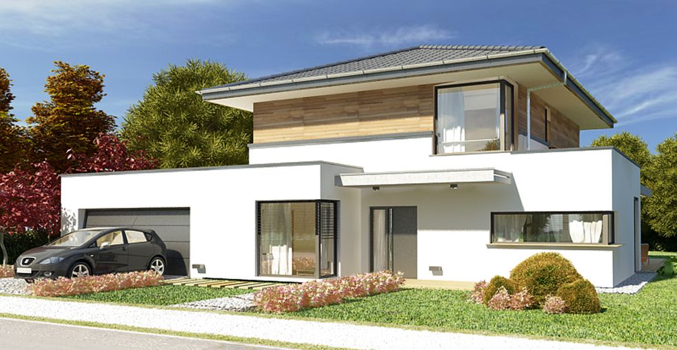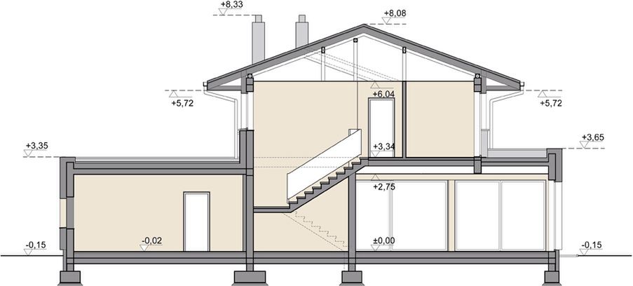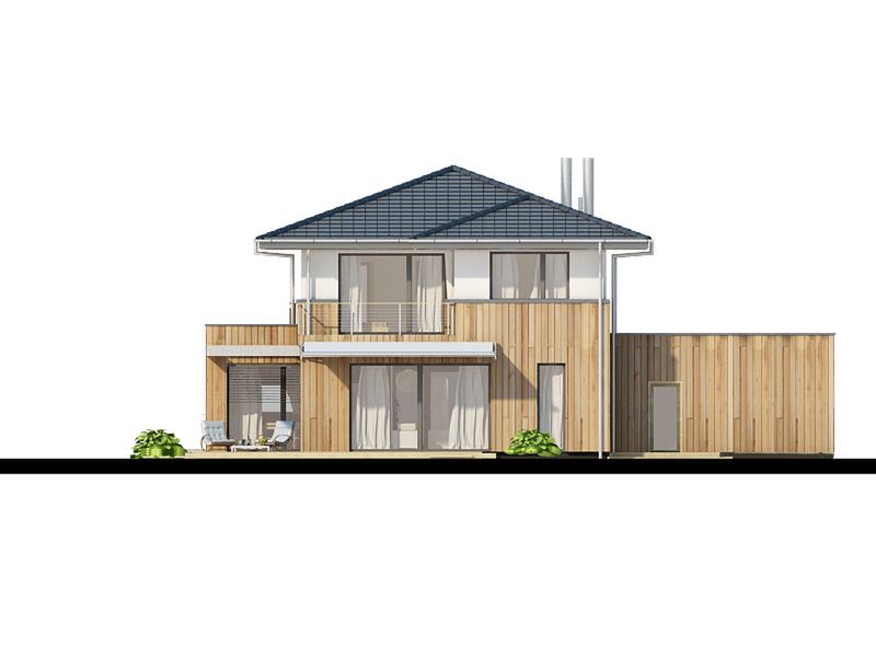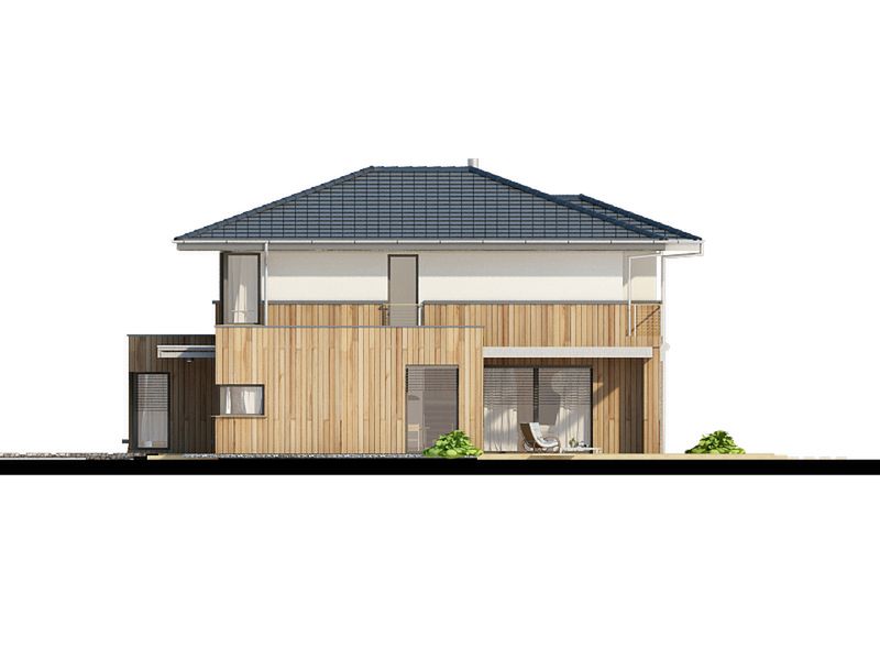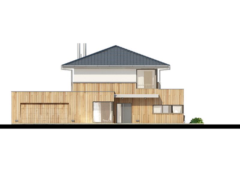 Fundamenty: żelbetowe, ściany fundamentowe z bloczków betonowych. Ściany: dwuwarstwowe - pustak ceramiczny + izolacja termiczna. Stropy: gęstożebrowe, miejscowo monolit. Dach: wielospadowy, konstrukcja drewniana, dachówka ceramiczna płaska/prostokątna, ciemnoszara np. BRASS Tegalit lub gont bitumiczny. Obróbki blacharskie z blachy powlekanej, tytan-ocynk. Elewacja: tynk strukturalny, cienkowartstwowy i drewno elewacyjne, olejowane +okładzina drewniana, drewnopodobna. Stolarka zewnętrzna: PVC, lub aluminiowa, lub drewniana w kolorze ciemnoszarym. Kominek: tak. Dostępna wersja z garażem 1-stanowiskowym oraz bez garażu.