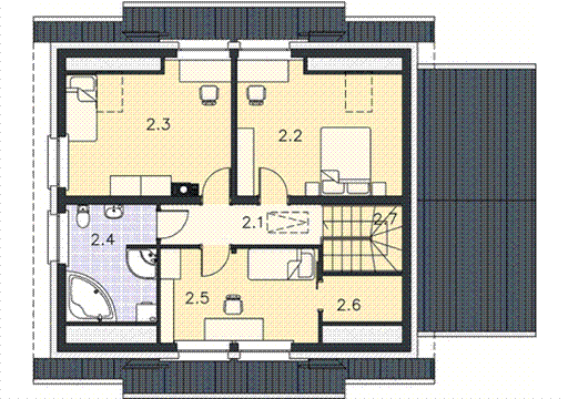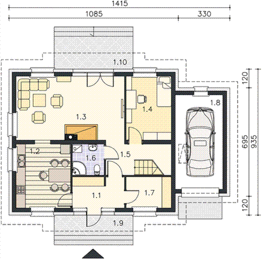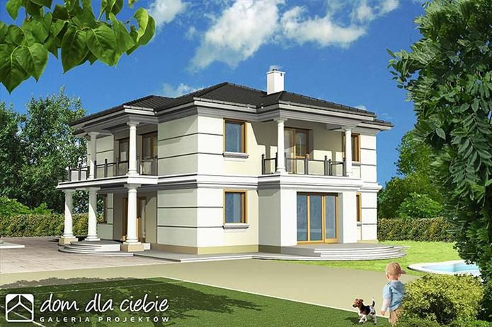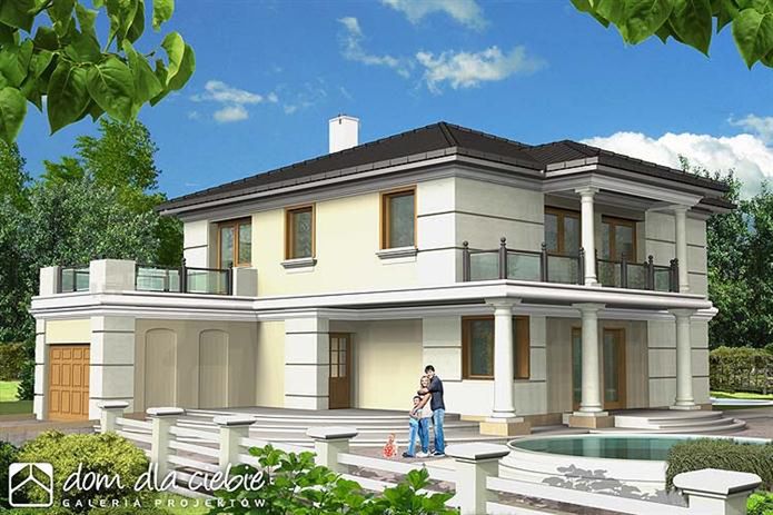 Graficzne opracowanie rzutów poglądowych widocznych na karcie projektu zostało wykonane przez Extradom.pl. Prezentowane przez Extradom.pl wizualizacje wykonane zostały przez autora projektu i należy poczytywać je jedynie za przykład i propozycję wykończenia, wizję architektoniczną autora projektu. Ostateczne wykończenie budynku może nastąpić na wiele sposobów. Szczegółowe rozwiązania zastosowane w oferowanej dokumentacji - w tym również ilość, lokalizacje i wygląd okien, drzwi, kominów - mogą w niewielkim stopniu różnić się od prezentowanej wizualizacji budynku.
