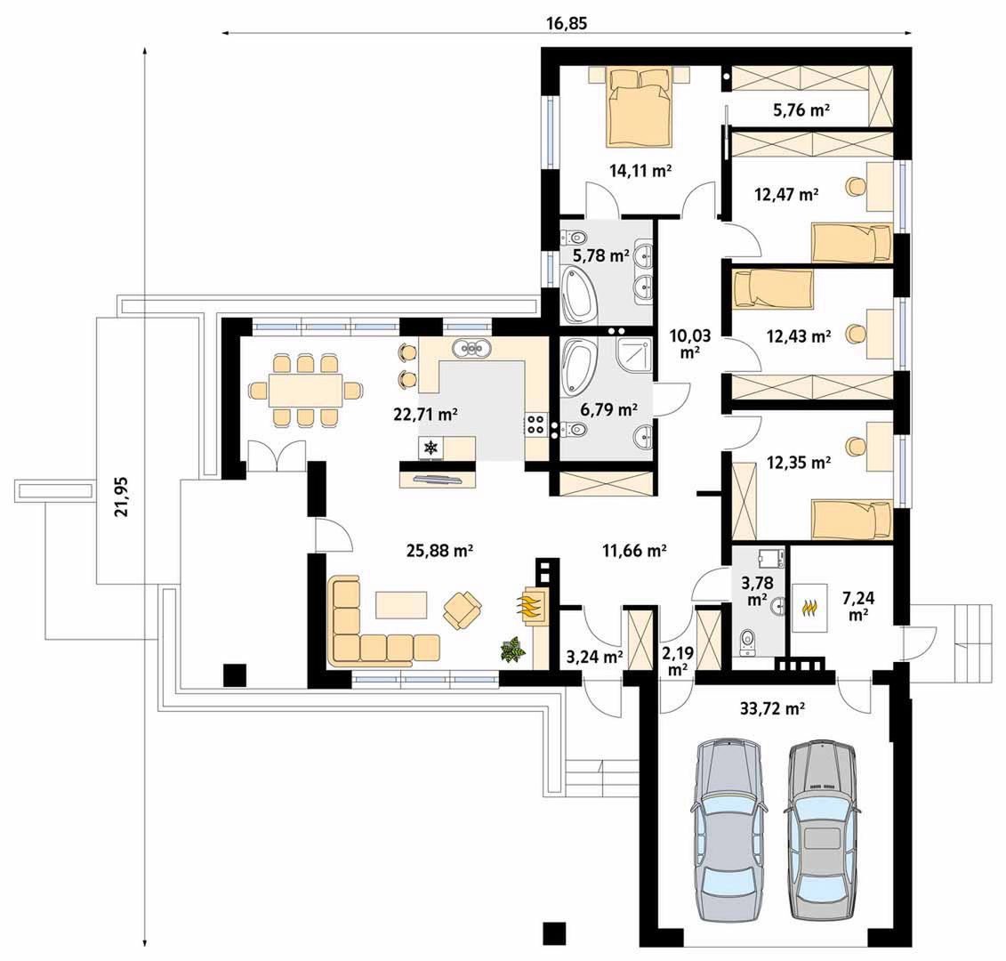 Graficzne opracowanie rzutów poglądowych widocznych na karcie projektu zostało wykonane przez Extradom.pl. Prezentowane przez Extradom.pl wizualizacje wykonane zostały przez autora projektu i należy poczytywać je jedynie za przykład i propozycję wykończenia, wizję architektoniczną autora projektu. Ostateczne wykończenie budynku może nastąpić na wiele sposobów. Szczegółowe rozwiązania zastosowane w oferowanej dokumentacji - w tym również ilość, lokalizacje i wygląd okien, drzwi, kominów - mogą w niewielkim stopniu różnić się od prezentowanej wizualizacji budynku.