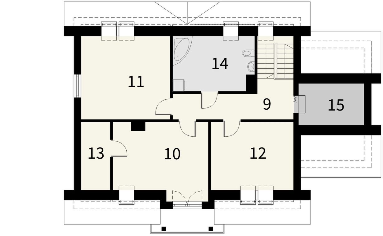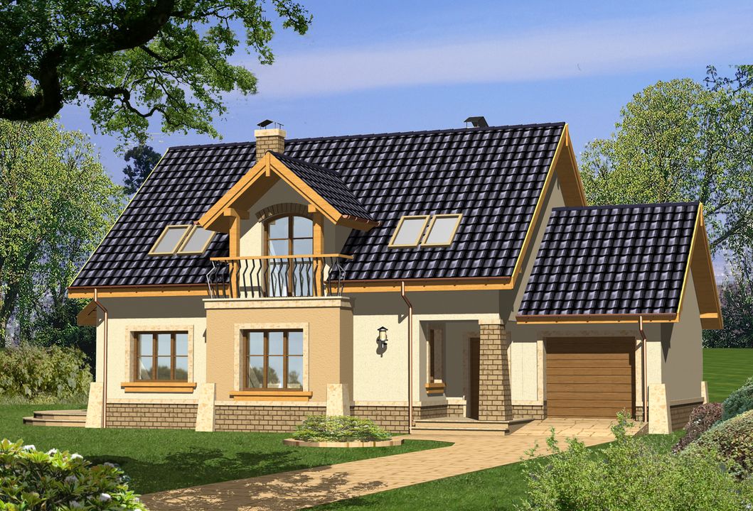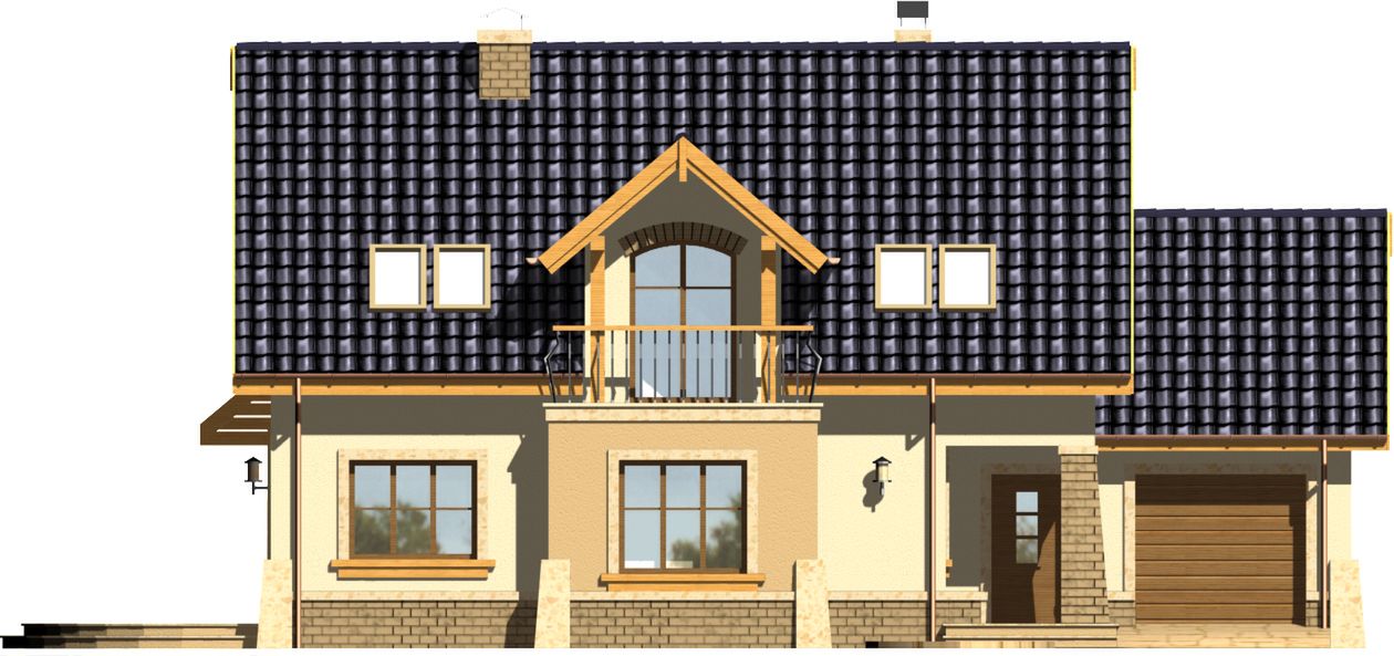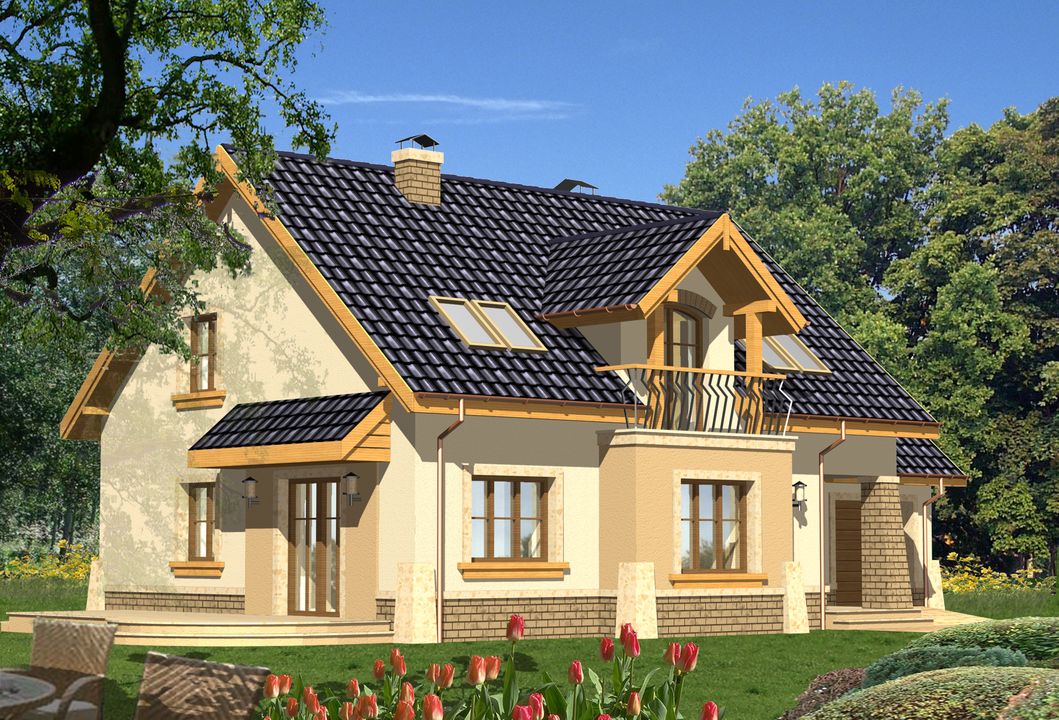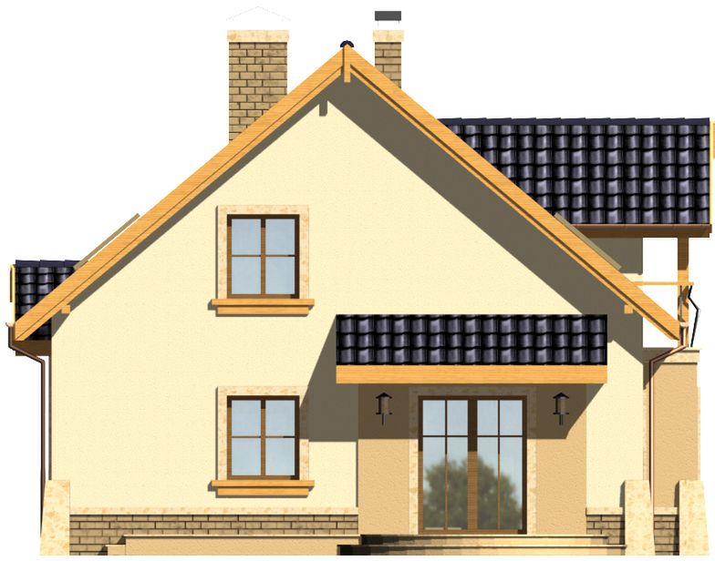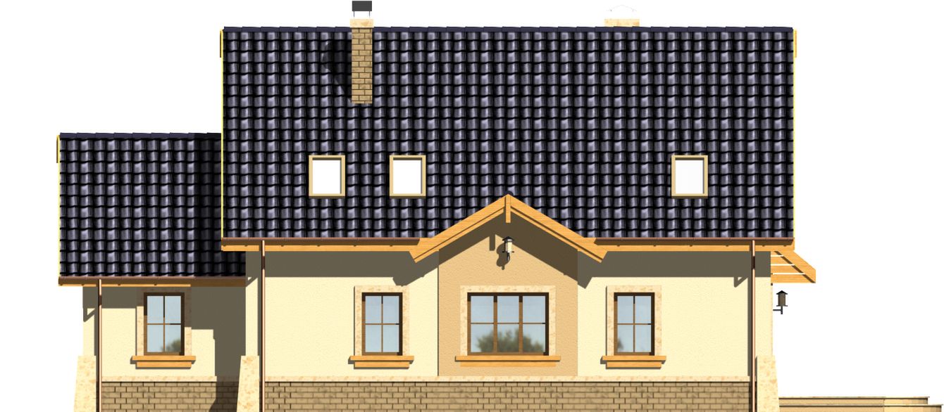 Graficzne opracowanie rzutów poglądowych widocznych na karcie projektu zostało wykonane przez Extradom.pl. Prezentowane przez Extradom.pl wizualizacje wykonane zostały przez autora projektu i należy poczytywać je jedynie za przykład i propozycję wykończenia, wizję architektoniczną autora projektu. Ostateczne wykończenie budynku może nastąpić na wiele sposobów. Szczegółowe rozwiązania zastosowane w oferowanej dokumentacji - w tym również ilość, lokalizacje i wygląd okien, drzwi, kominów - mogą w niewielkim stopniu różnić się od prezentowanej wizualizacji budynku.
