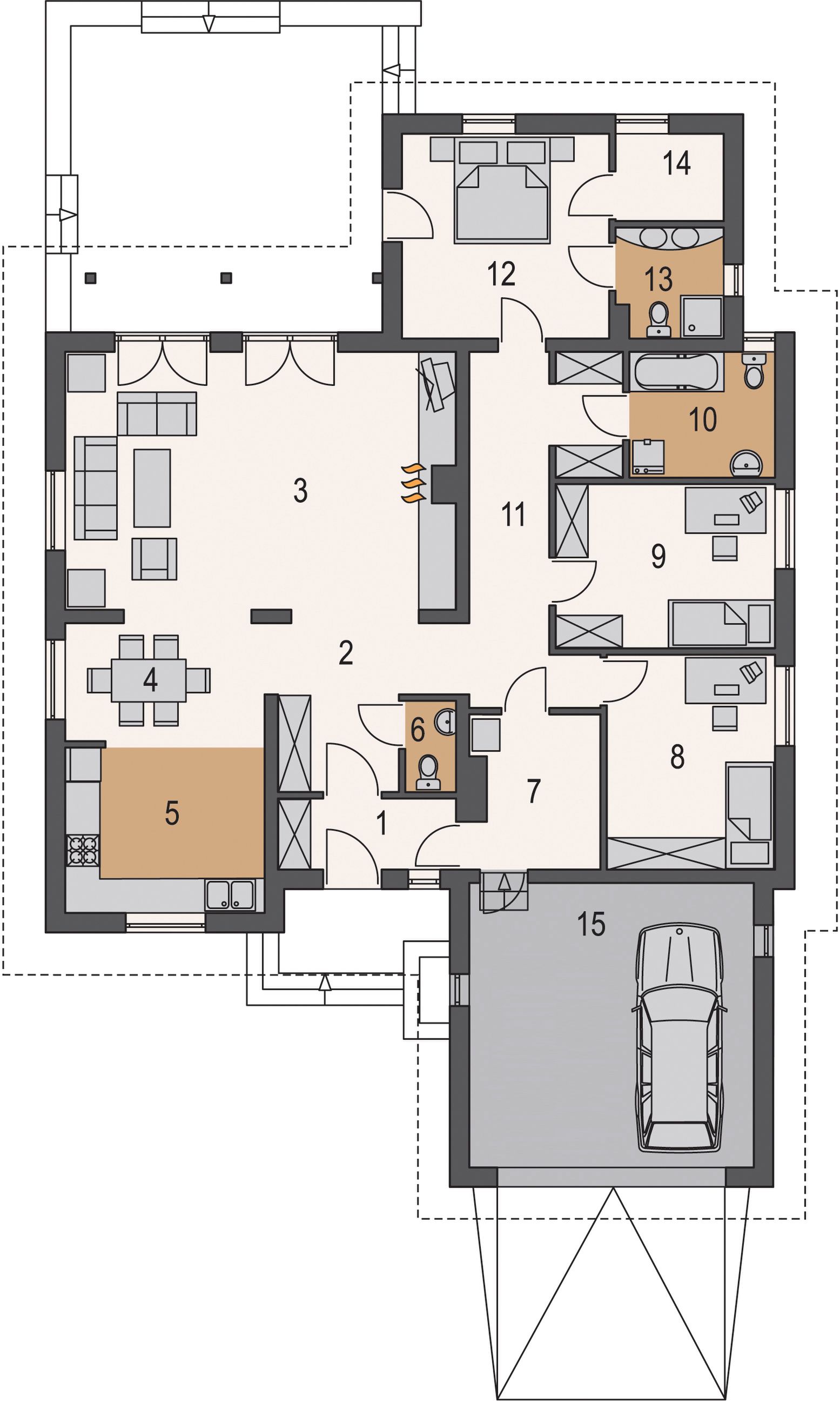 Graficzne opracowanie rzutów poglądowych widocznych na karcie projektu zostało wykonane przez Extradom.pl. Prezentowane przez Extradom.pl wizualizacje wykonane zostały przez autora projektu i należy poczytywać je jedynie za przykład i propozycję wykończenia, wizję architektoniczną autora projektu. Ostateczne wykończenie budynku może nastąpić na wiele sposobów. Szczegółowe rozwiązania zastosowane w oferowanej dokumentacji - w tym również ilość, lokalizacje i wygląd okien, drzwi, kominów - mogą w niewielkim stopniu różnić się od prezentowanej wizualizacji budynku.