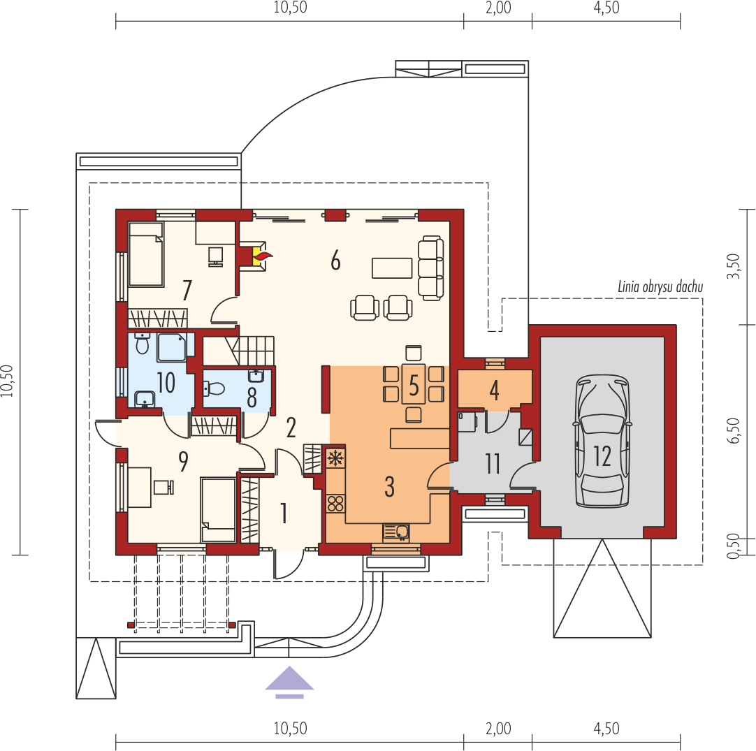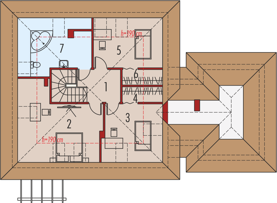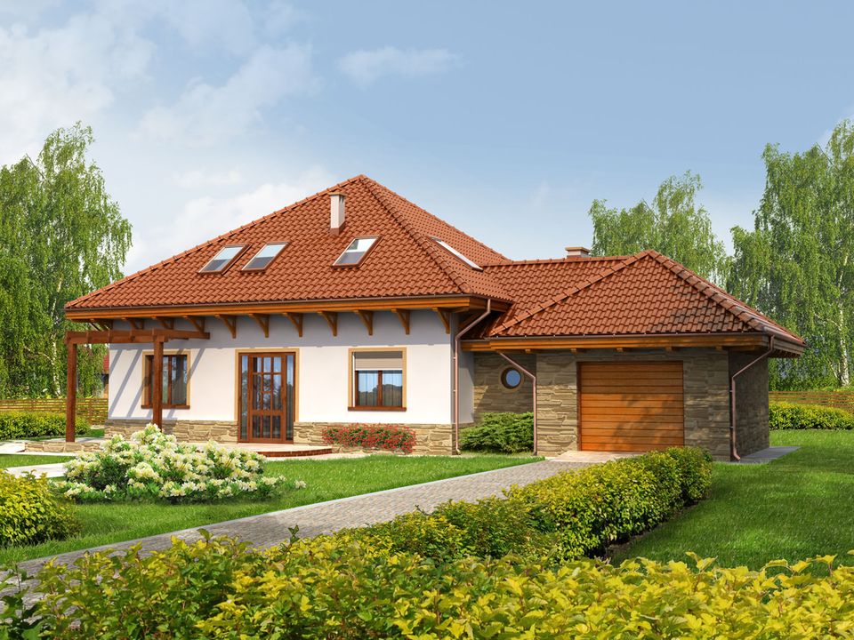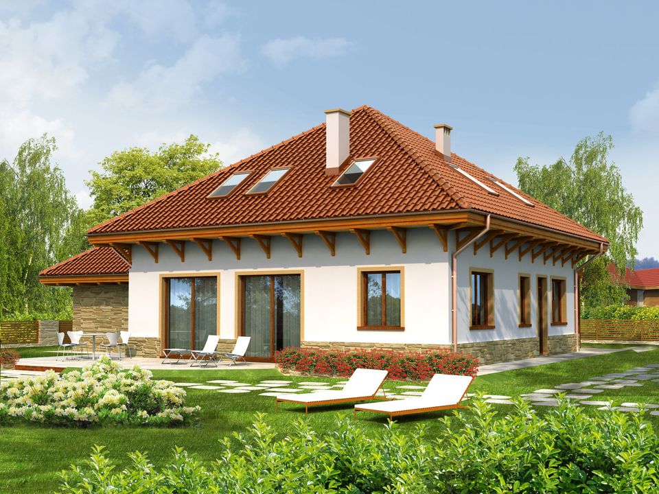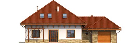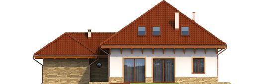 Graficzne opracowanie rzutów poglądowych widocznych na karcie projektu zostało wykonane przez Extradom.pl. Prezentowane przez Extradom.pl wizualizacje wykonane zostały przez autora projektu i należy poczytywać je jedynie za przykład i propozycję wykończenia, wizję architektoniczną autora projektu. Ostateczne wykończenie budynku może nastąpić na wiele sposobów. Szczegółowe rozwiązania zastosowane w oferowanej dokumentacji - w tym również ilość, lokalizacje i wygląd okien, drzwi, kominów - mogą w niewielkim stopniu różnić się od prezentowanej wizualizacji budynku.