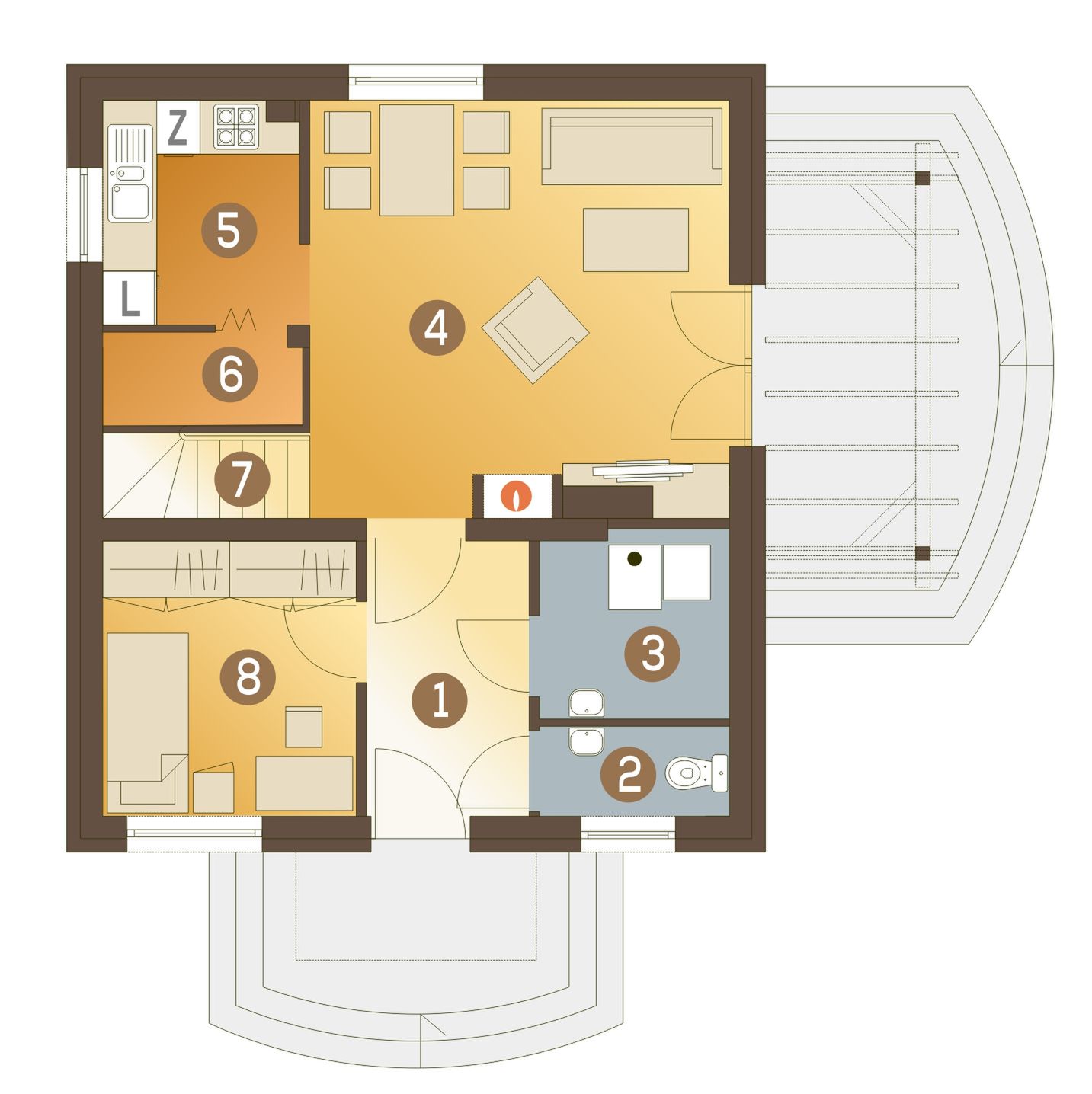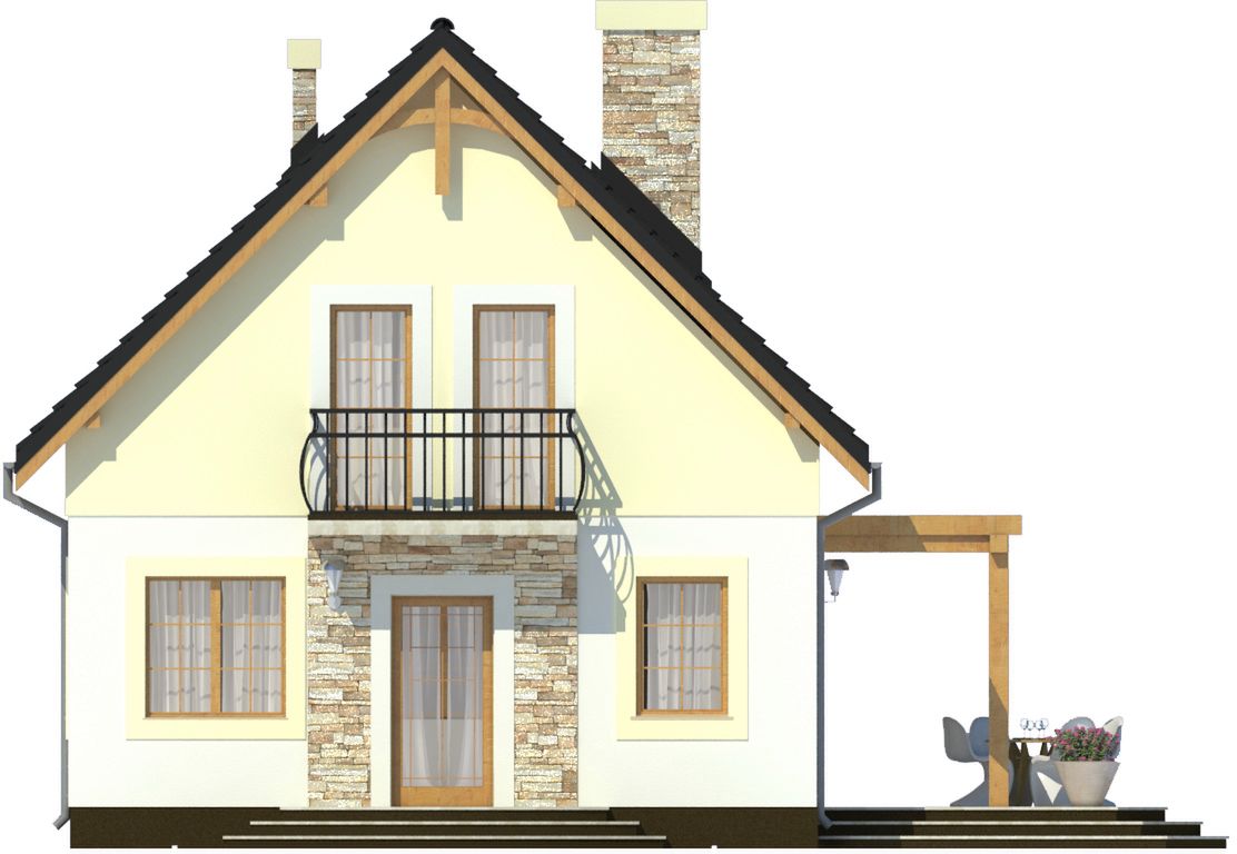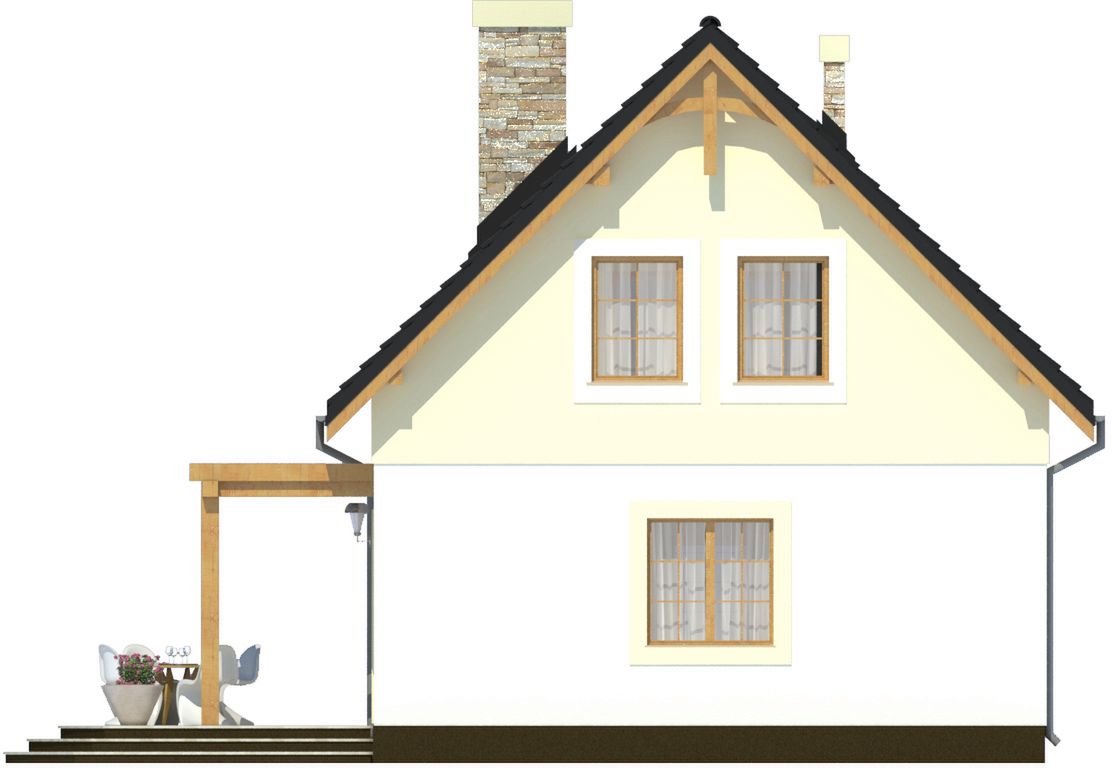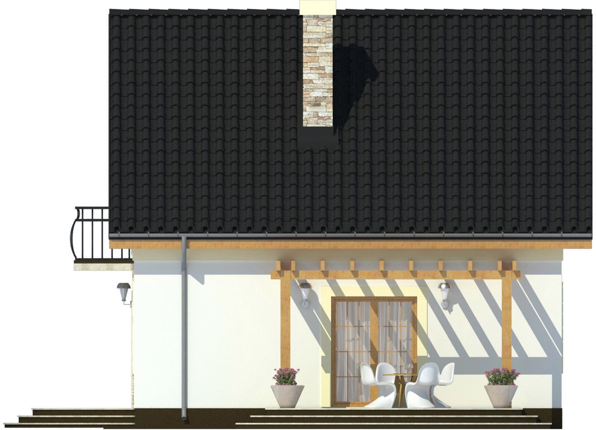 Graficzne opracowanie rzutów poglądowych widocznych na karcie projektu zostało wykonane przez Extradom.pl. Prezentowane przez Extradom.pl wizualizacje wykonane zostały przez autora projektu i należy poczytywać je jedynie za przykład i propozycję wykończenia, wizję architektoniczną autora projektu. Ostateczne wykończenie budynku może nastąpić na wiele sposobów. Szczegółowe rozwiązania zastosowane w oferowanej dokumentacji - w tym również ilość, lokalizacje i wygląd okien, drzwi, kominów - mogą w niewielkim stopniu różnić się od prezentowanej wizualizacji budynku.