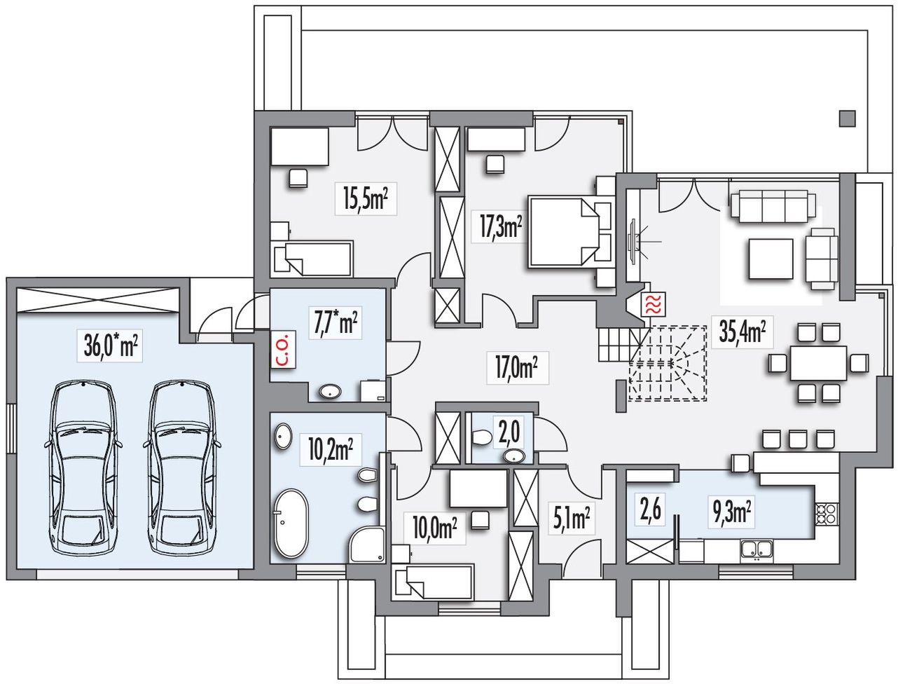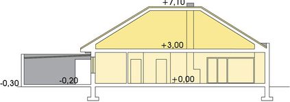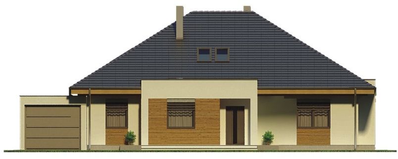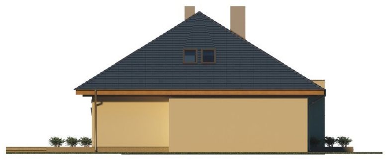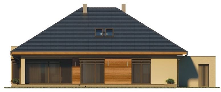 Graficzne opracowanie rzutów poglądowych widocznych na karcie projektu zostało wykonane przez Extradom.pl. Prezentowane przez Extradom.pl wizualizacje wykonane zostały przez autora projektu i należy poczytywać je jedynie za przykład i propozycję wykończenia, wizję architektoniczną autora projektu. Ostateczne wykończenie budynku może nastąpić na wiele sposobów. Szczegółowe rozwiązania zastosowane w oferowanej dokumentacji - w tym również ilość, lokalizacje i wygląd okien, drzwi, kominów - mogą w niewielkim stopniu różnić się od prezentowanej wizualizacji budynku.